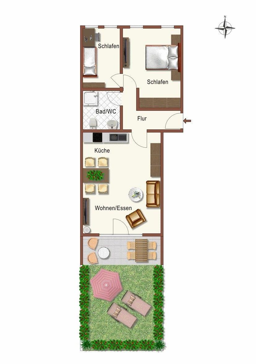 Die geräumige und sehr geschmackvoll eingerichtete moderne 3-Zimmer-Wohnung (ca. 66 m²) im Erdgeschoss besitzt ein hohes Maß an Funktionalität und ist komplett eingerichtet. Die Fußböden der Wohnung sind hochwertiger Vinyl-Design-Belag, das Bad / WC ist gefliest.