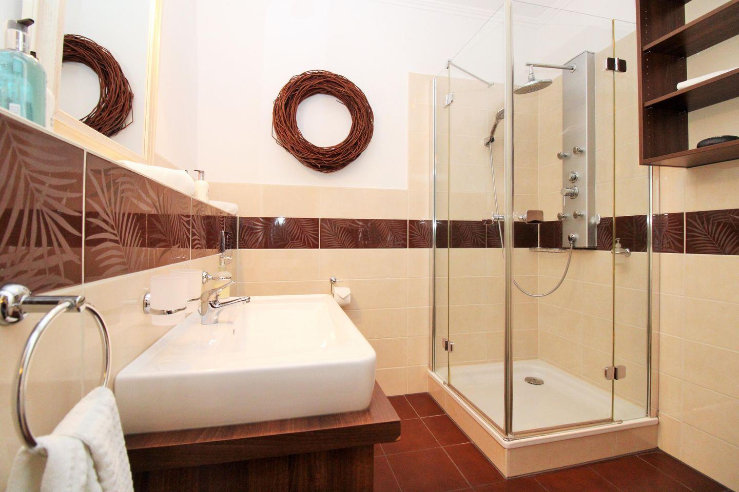 Das moderne und exklusive Badezimmer verfügt über eine geräumige Dusche mit Echtglas-Duschtrennwand, Waschbecken mit Unterschrank, WC sowie ausreichend Ablagemöglichkeiten.