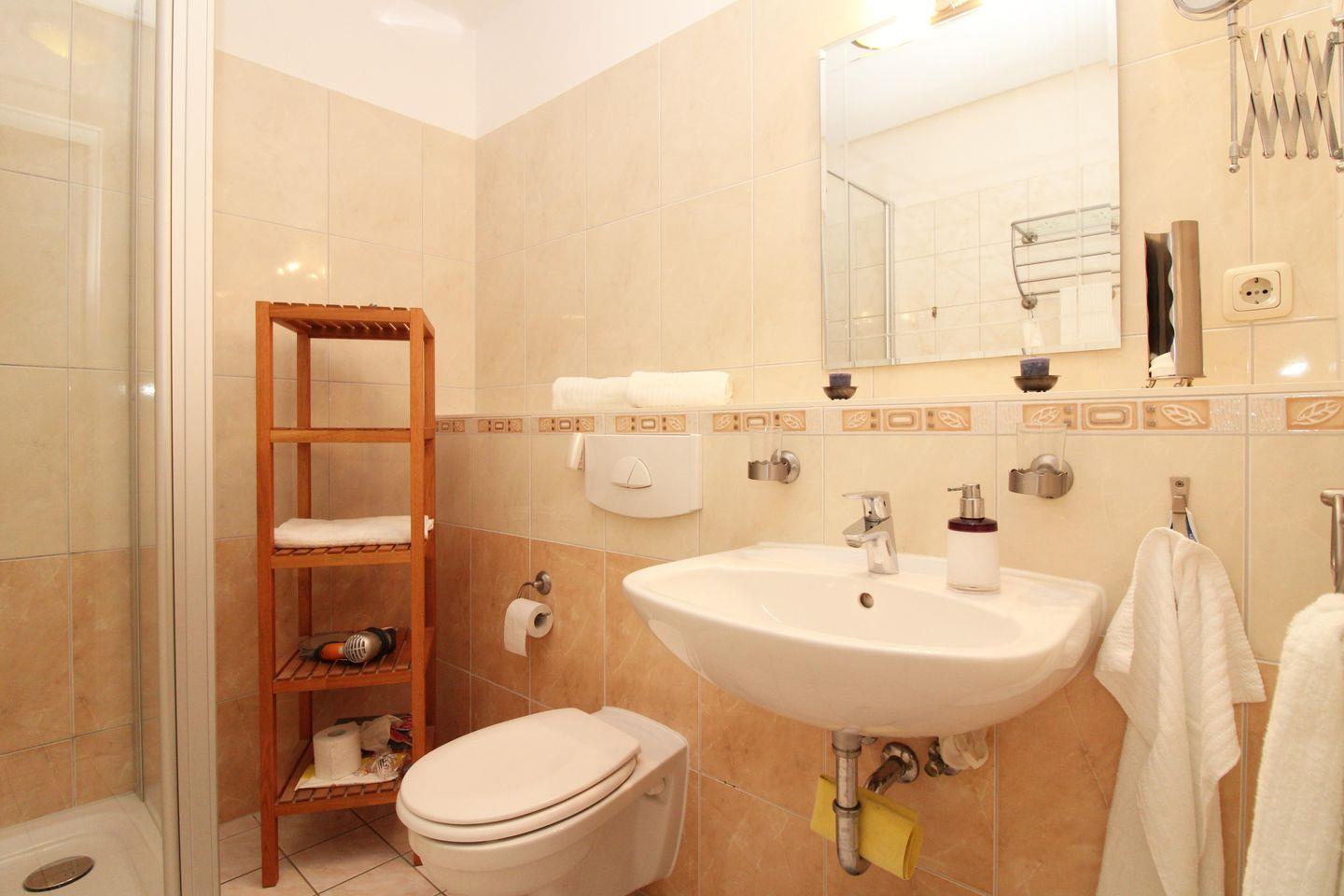 Das moderne und freundliche Badezimmer verfügt über eine Echtglas-Dusche mit niedrigem (seniorenfreundlichem!) Einstieg, WC, Waschbecken, Regal, Föhn, Kosmetikspiegel sowie ausreichend Ablageflächen.
