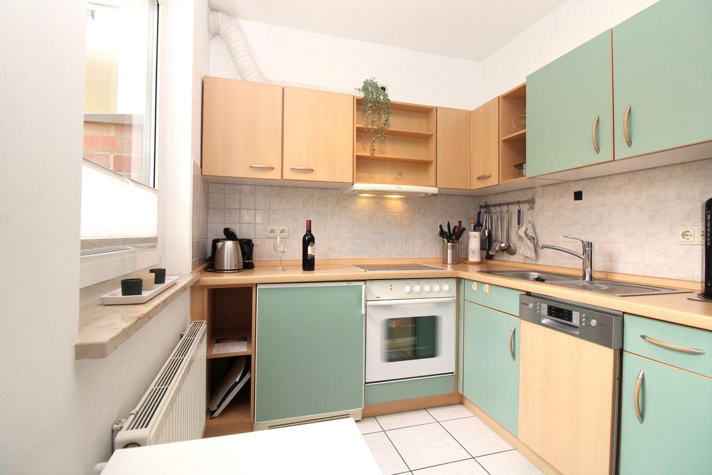 Die offene und komplett ausgestattete Küche verfügt über eine Einbauküchenzeile mit Kühlschrank und Gefrierfach, einen 4-Platten-Ceranfeld-Herd, Dunstabzug, Backofen, Geschirrspüler sowie Kaffeemaschine, Wasserkocher und Toaster. Die Küche ist mit Geschirr, Gläsern, Besteck und Töpfen bestens und ausreichend ausgestattet.