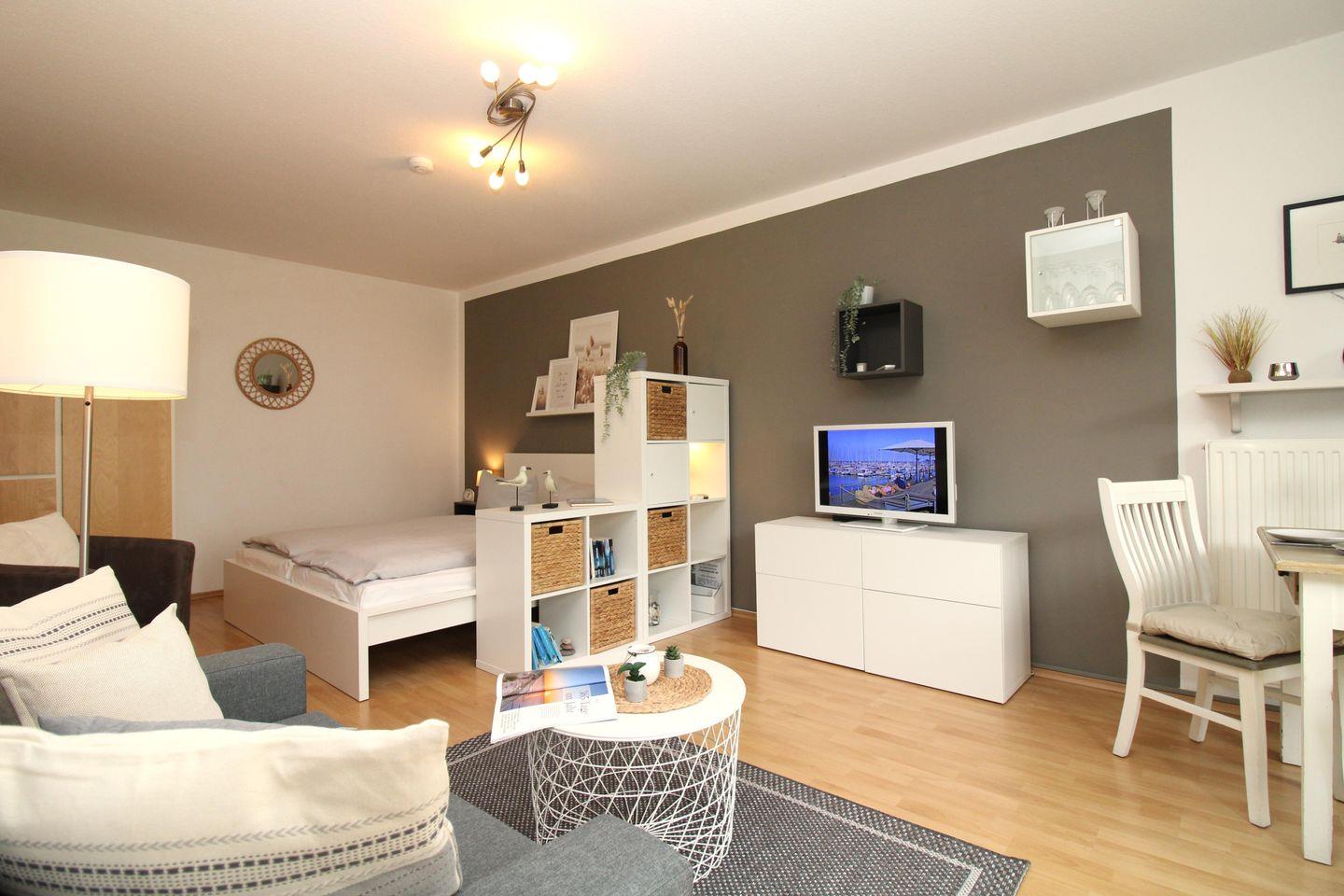 Die freundliche und gemütlich eingerichtete 1-Zimmer-Wohnung (ca. 38 m²) befindet sich im Erdgeschoss. Die Wohnung besitzt ein hohes Maß an Funktionalität und ist komplett ausgestattet. Der Bodenbelag ist Laminat, die Küche und das Bad / WC sind gefliest.