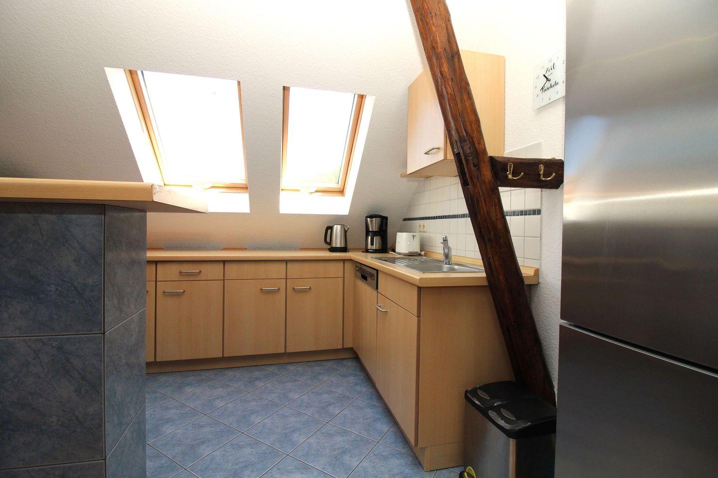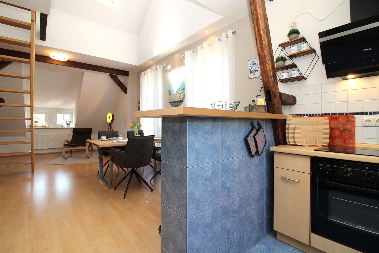 Die halb offene Küche beinhaltet eine voll ausgestattete Einbauküchenzeile mit 4-Platten-Ceran-Kochfeld, Backofen, Dunstabzug, Mikrowelle, Kühlschrank mit Gefrierfach, Geschirrspülmaschine, Kaffeemaschine, Wasserkocher und Toaster. Die Küche ist mit Geschirr, Gläsern, Besteck und Töpfen vollständig ausgestattet. Ein Tresen mit 4 Barhockern bietet sich für die kleine Mahlzeit zwischendurch an.