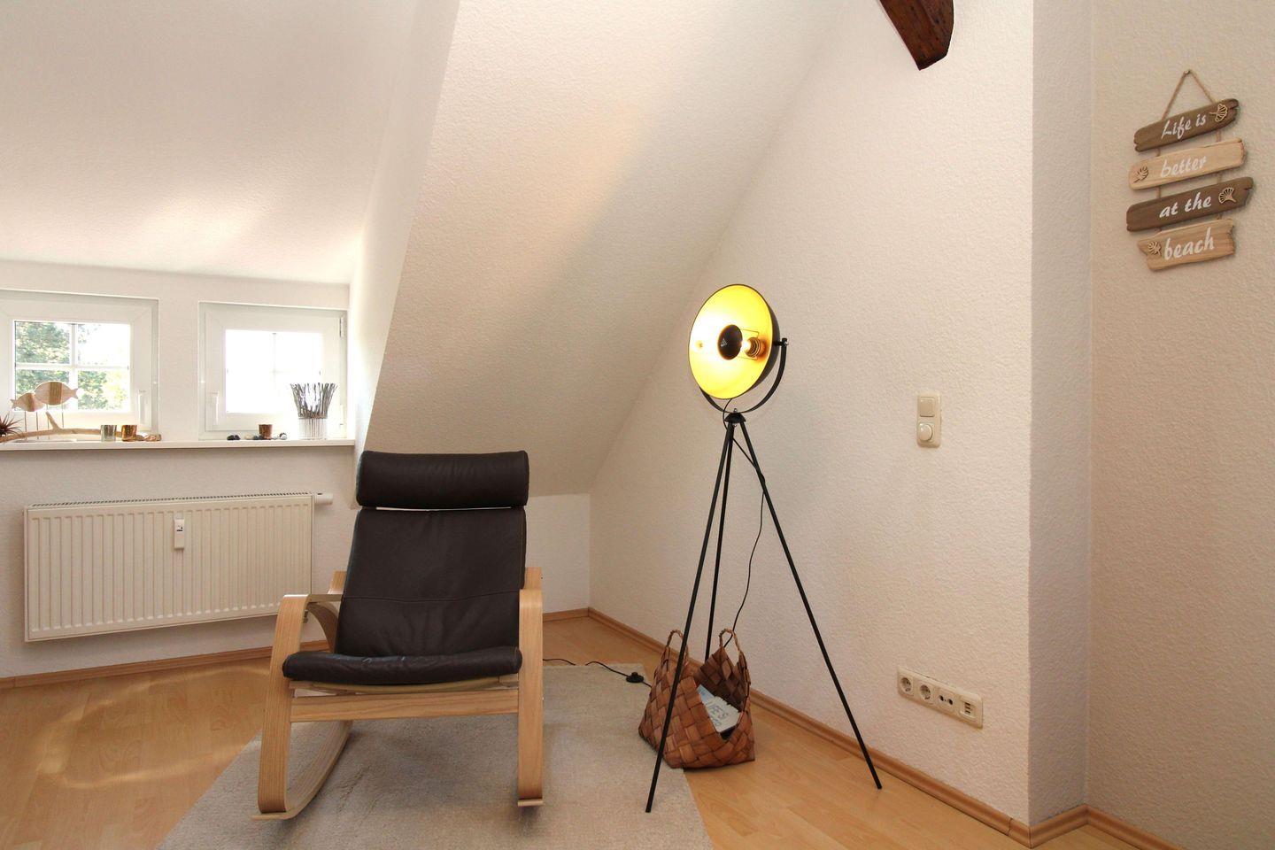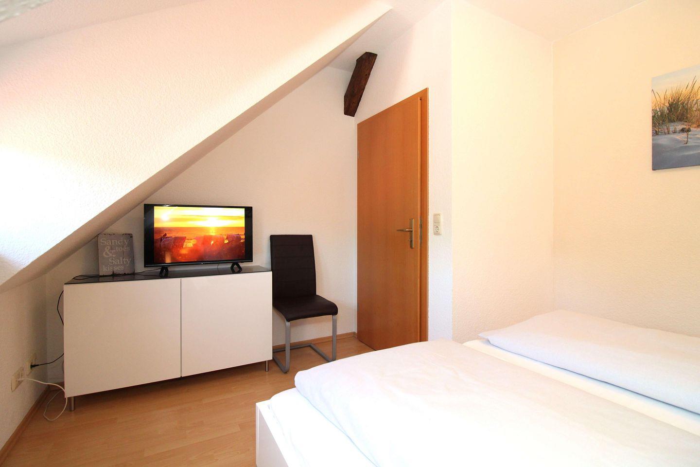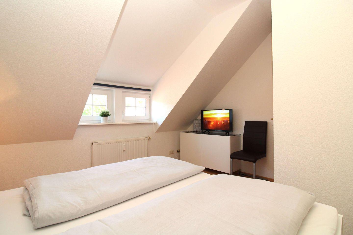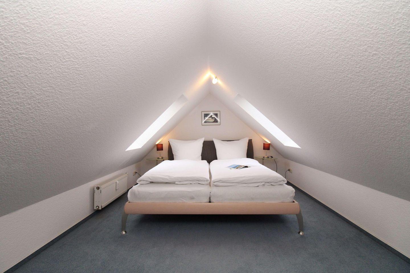 Das sehr gemütliche und über eine kleine Treppe aus dem Wohnzimmer erreichbare 2. Schlafzimmer in der Galerie (OG) der Wohnung verfügt ebenfalls über ein bequemes Doppelbett, Nachttische sowie einen Kommode.