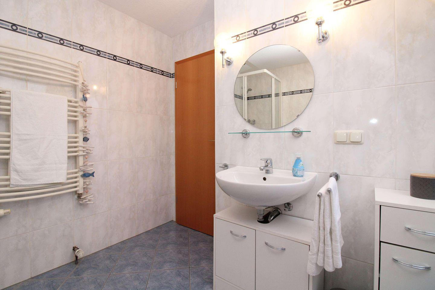Das helle und geräumige Badezimmer (mit Tageslicht / Fenster) verfügt über eine Dusche sowie zusätzlich eine Badewanne, Waschbecken und WC, einen Handtuch-Heizkörper, einen Waschtisch-Unterschrank sowie eine kleine Kommode und bietet ausreichend Ablagemöglichkeiten.