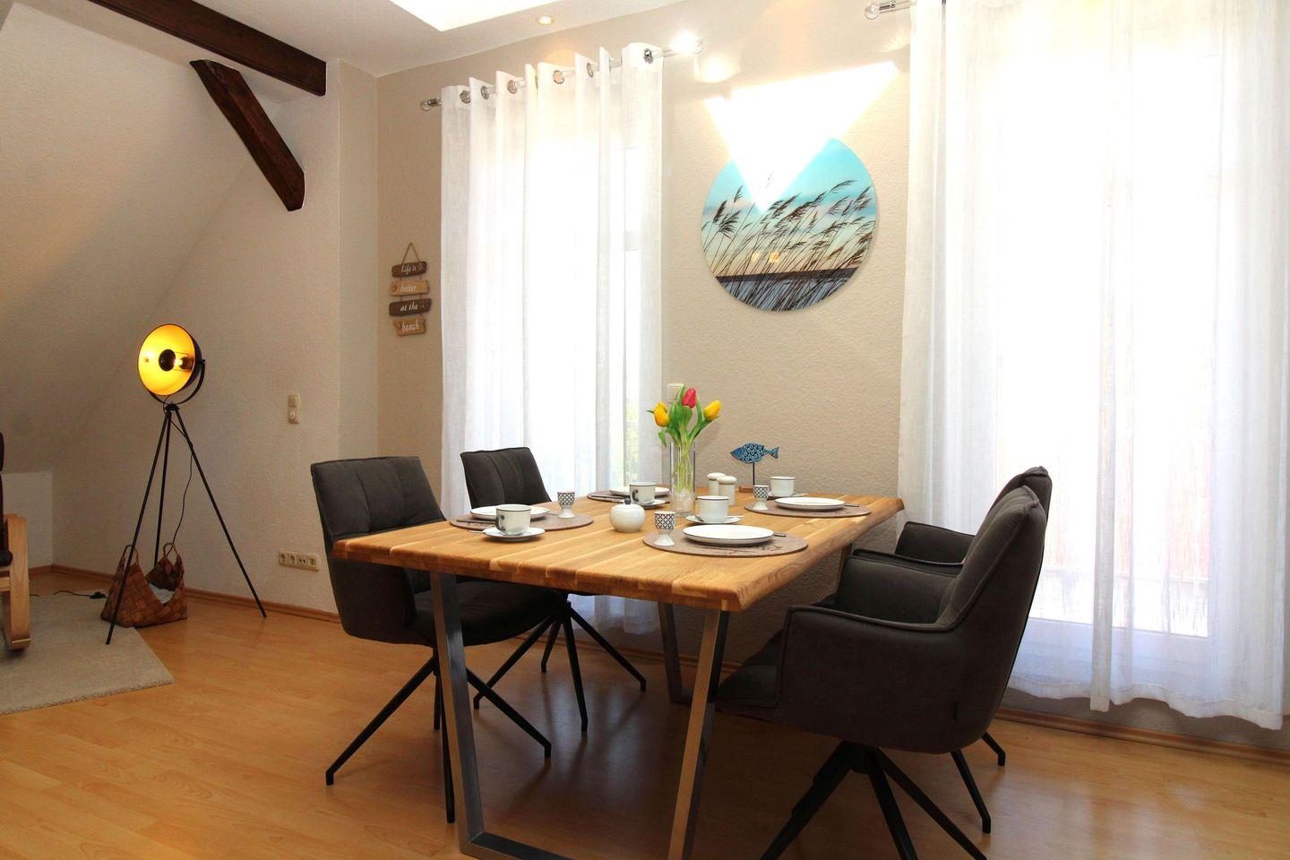 Das großzügige und gemütliche Wohn-/Esszimmer verfügt über eine separate Sitzgruppe mit bequemer und großer Leder-Eckcouch und Couchtisch, eine gemütliche Leseecke mit Freischwinger-Sessel, einen separaten Esstisch mit 4 Stühlen, ein Sideboard sowie 1 großen Schrank. Vom Wohn-/Esszimmer aus haben Sie direkten Zugang zu dem kleinen Balkon (nach Süd-Westen ausgerichtet) mit 2 Stühlen und Balkontisch. Hier sitzen Sie entspannt und gemütlich mit Blick ins Grüne und können abends bei einem guten Glas Wein in Ruhe die lauen Sommernächte genießen!