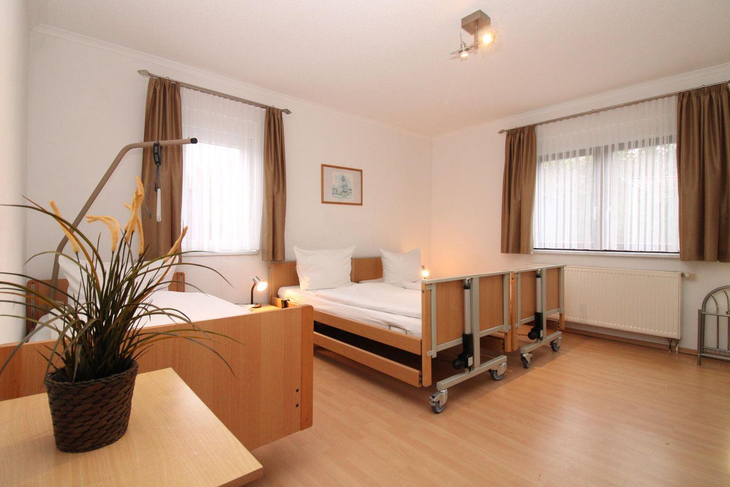 Das helle und geräumige 1. Schlafzimmer ist mit einem bequemen und elektrisch verstellbaren Pflege-Doppelbett, einem einzelnstehenden elektrisch verstellbaren Pflegebett, einem Einzelbett (90x200), Nachttischen, einem fahrbaren Beistelltisch, einem Stuhl sowie einem geräumigen Kleiderschrank eingerichtet.