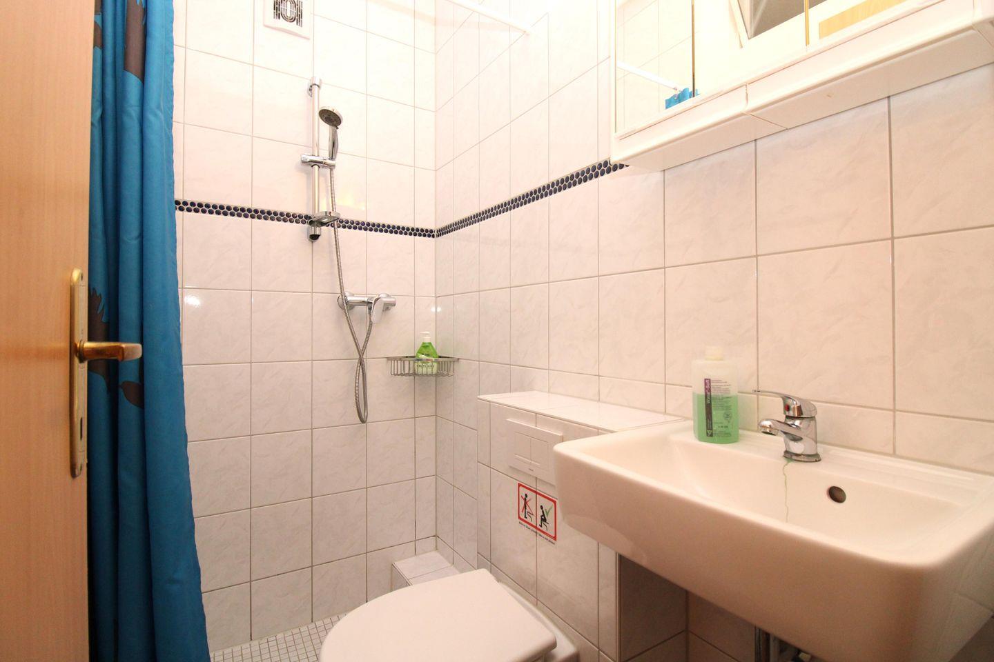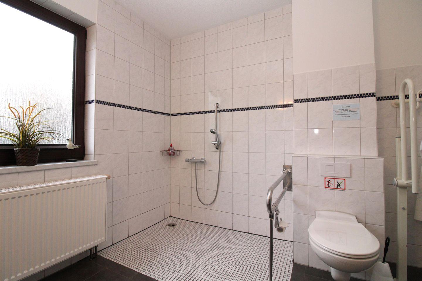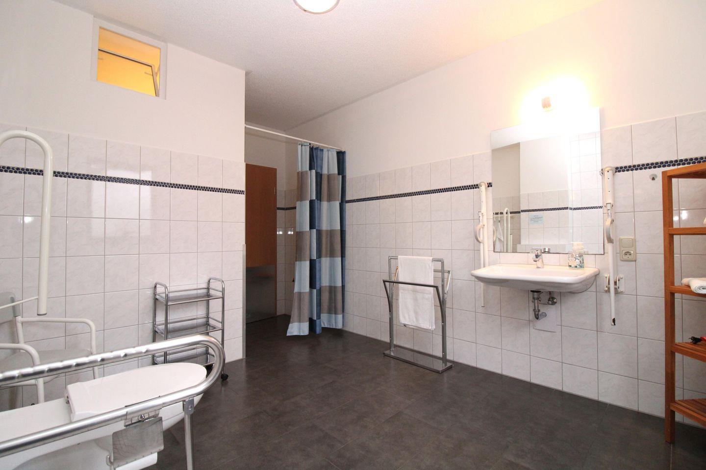 Das rollstuhlgerechte und sehr geräumige Badezimmer (mit Tageslicht / Fenster) verfügt über eine bodenebene befahrbare Dusche, einen Pflege-Duschstuhl, WC, Waschbecken, Kosmetikspiegel, Föhn sowie ausreichend Ablagemöglichkeiten. Im Eingangsbereich des Badezimmers befindet sich räumlich abgetrennt noch eine separate weitere Dusche mit Waschbecken, Spiegelschrank und WC.