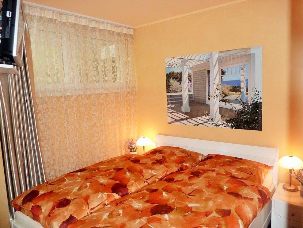 Der gemütliche Schlafbereich ist mit einem bequemen französischen Doppelbett, Nachttischen sowie einem geräumigen begehbaren Kleiderschrank eingerichtet. Hier steht Ihnen ebenfalls ein weiteres TV-Gerät zur Verfügung. Eine zusätzliche bequeme Schlafmöglichkeit für eine weitere 3. bzw. 4. Person bietet die ausklappbare Ledercouch mit Federkernmatratze (ca. 1,60 m breit) im Wohnzimmer.