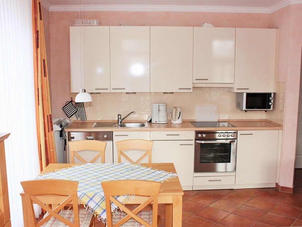Der offene Küchenbereich beinhaltet eine voll ausgestattete Einbauküchenzeile in gehobener Ausstattung mit 4-Platten-Ceran-Kochfeld, Backofen, Mikrowelle, Dunstabzug, Kühlschrank mit Gefrierfach, Geschirrspülmaschine, Kaffeemaschine, Wasserkocher und Toaster. Die Küche ist mit Geschirr, Gläsern, Besteck und Töpfen bestens und vollständig ausgestattet.