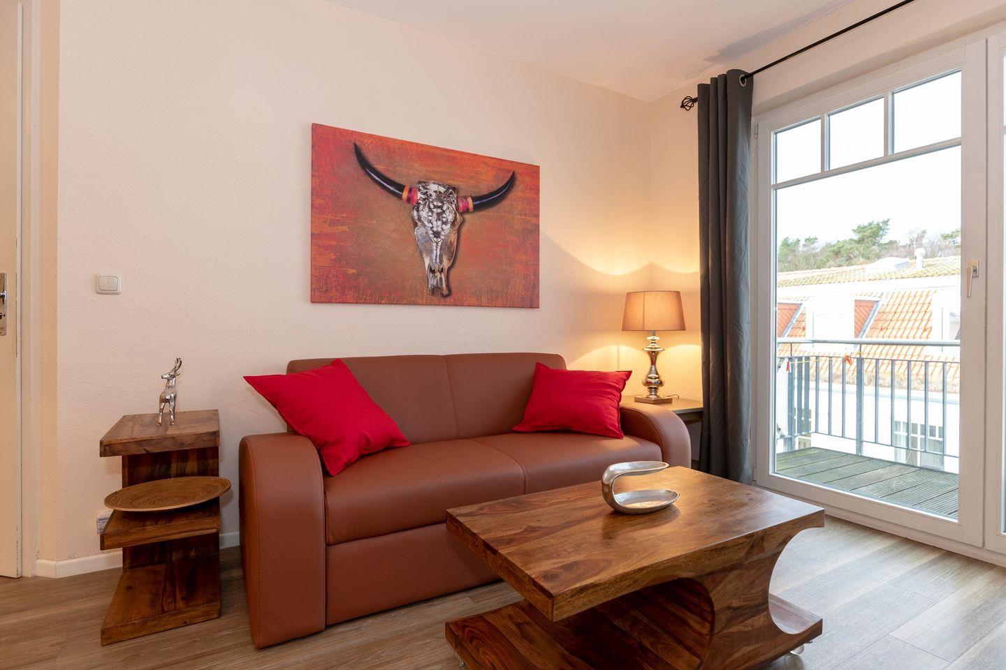 Das moderne und sehr gemütlich eingerichtete Wohn-/Esszimmer verfügt über eine separate Echtleder-Sitzgruppe mit bequemer (Schlaf-)Couch, Sessel und Couchtisch, einen separaten Esstisch mit 4 Stühlen sowie ein Sideboard. Vom Wohnzimmer aus haben Sie direkten Zugang zum sonnigen Balkon (nach Süd-Westen ausgerichtet) mit Balkonmöbeln - hier sitzen Sie entspannt und können die Sonne nach Ihrem Strandtag noch ausgiebig genießen!
