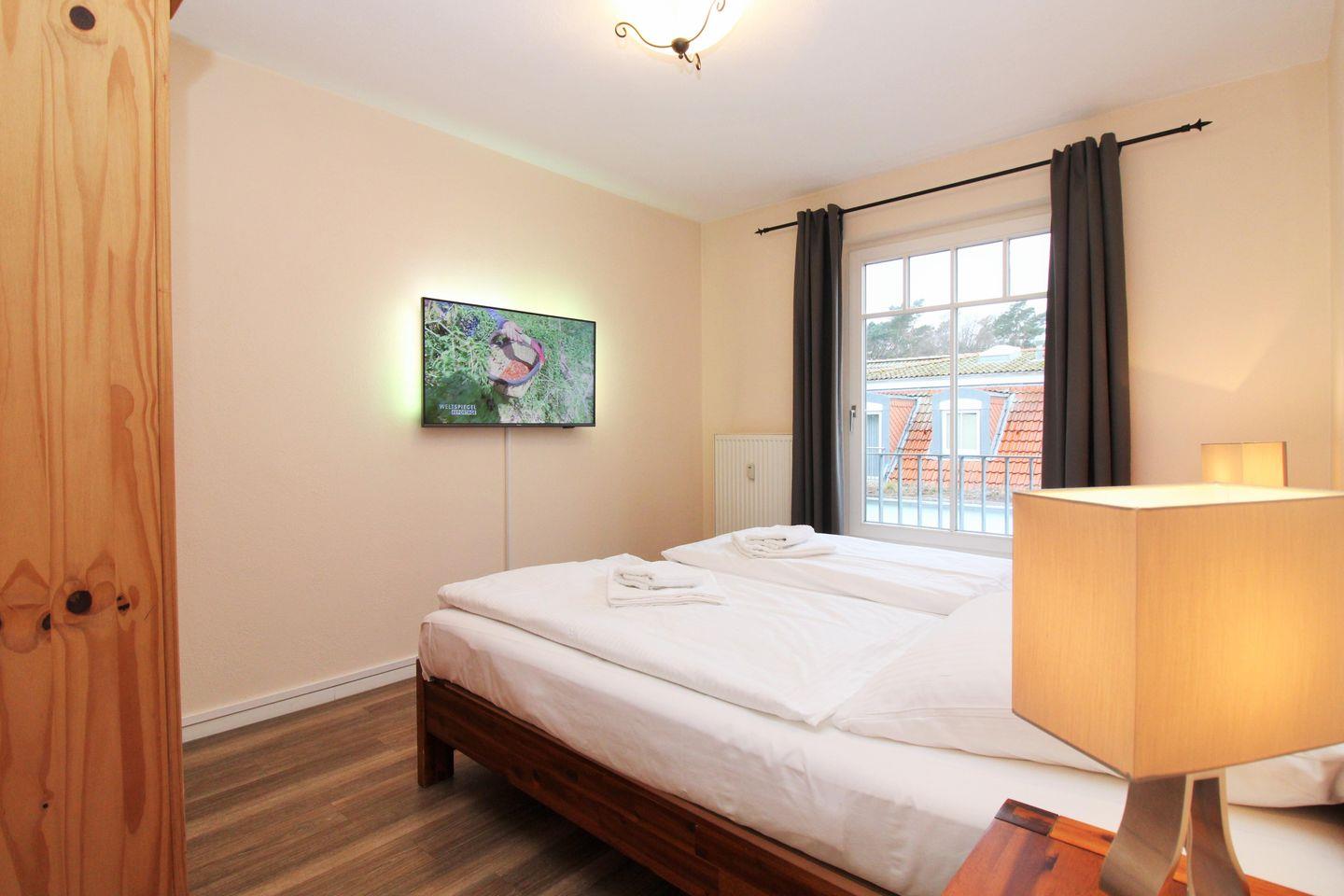 Das freundliche und gemütliche Schlafzimmer ist mit einem bequemen Doppelbett (2 getrennte Matratzen mit 90 cm x 200 cm), Nachttischen sowie einem geräumigen Kleider-schrank eingerichtet. Hier steht Ihnen ebenfalls ein modernes Flachbild-TV-Gerät zur Verfügung.