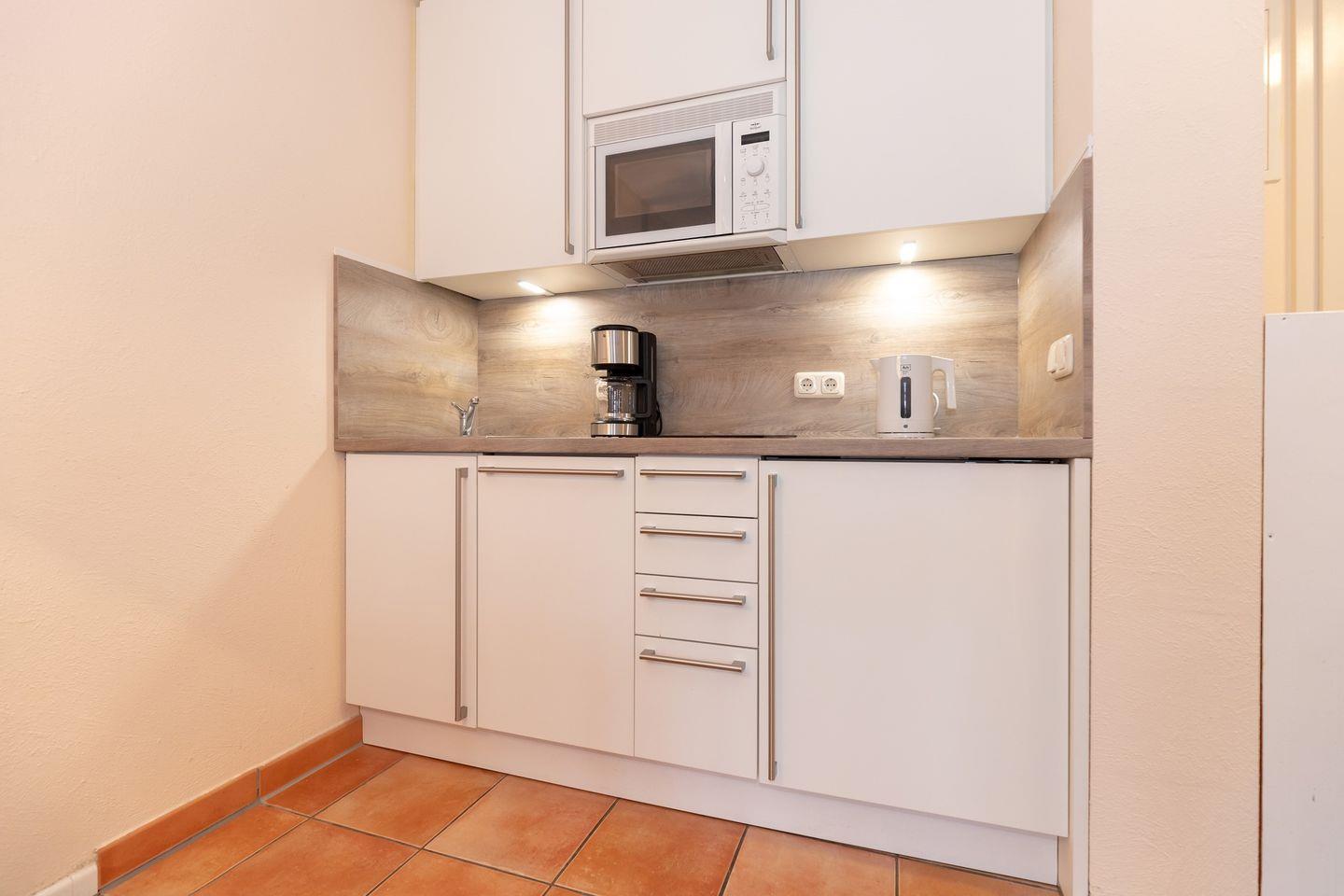 Die an den Wohn-/Essbereich angrenzende offene Küche beinhaltet eine voll ausgestattete und moderne Einbauküchenzeile mit 2-Platten-Ceran-Kochfeld, Dunstabzugshaube, Backofen, Mikrowelle, Kühlschrank mit Gefrierfach, Geschirrspülmaschine, Kaffeemaschine, Wasserkocher, Toaster und Eierkocher. Die Küche ist mit Geschirr, Gläsern, Besteck und Töpfen bestens und ausreichend ausgestattet.