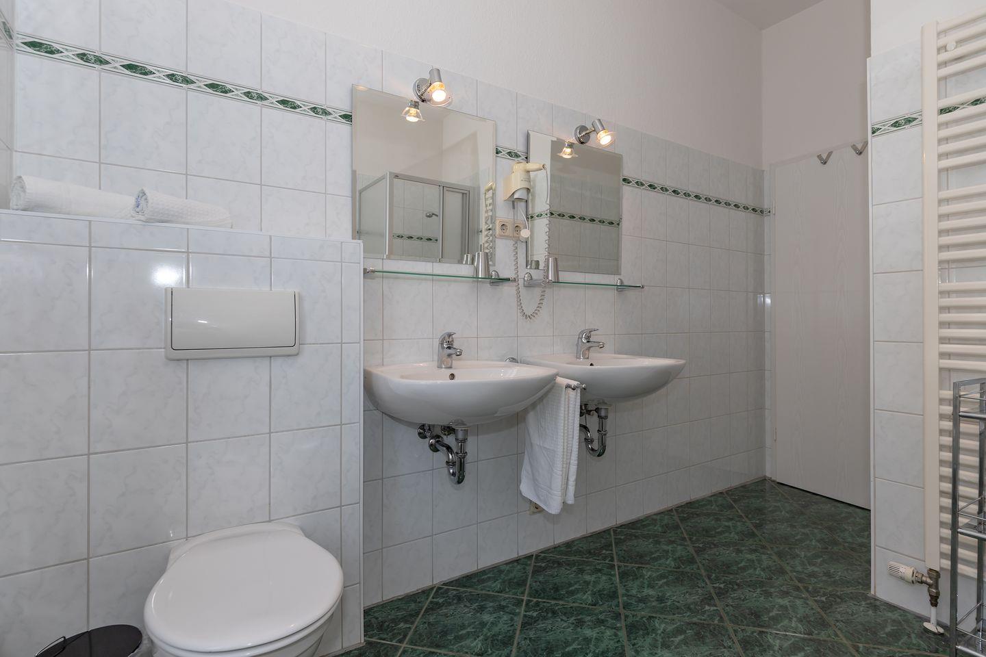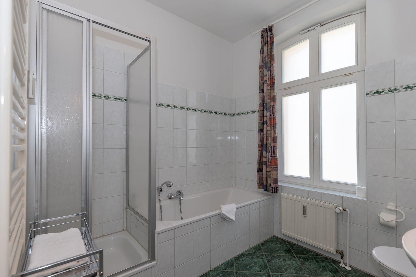 Das große und moderne Badezimmer (mit Fenster / Tageslicht!) verfügt über Dusche und Badewanne, 2 Waschbecken, WC, Handtuch-Heizkörper sowie ausreichend Ablage-möglichkeiten. Darüber hinaus hat die Wohnung eine zusätzliche Gästetoilette.