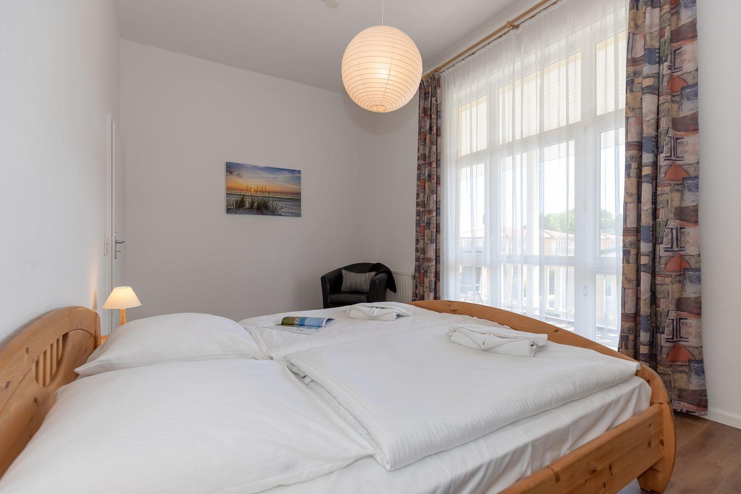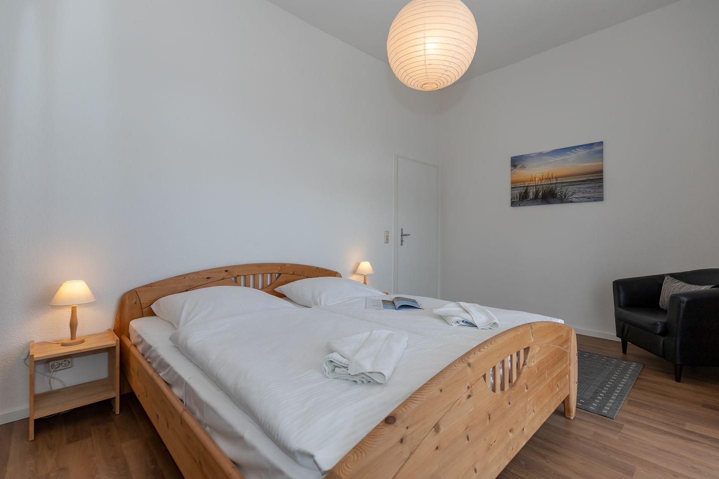 Das großzügige 1. Schlafzimmer ist mit einem bequemen Doppelbett, Nachttischen, einem Sessel sowie einem geräumigen Kleiderschrank eingerichtet.