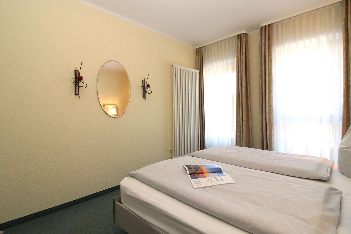 Das helle und geräumige Schlafzimmer ist mit einem bequemen Doppelbett mit neuen hochwertigen Matratzen (2 x 90 cm x 200 cm), Nachttischen mit Lampen, einem Kleiderschrank sowie einer Kommode eingerichtet und hat ebenfalls direkten Zugang zum Balkon. Eine zusätzliche bequeme Schlafmöglichkeit für eine weitere 3. bzw. 4. Person bietet das komfortable ausklappbare Schrankbett (150 cm x 200 cm) im Wohnzimmer.