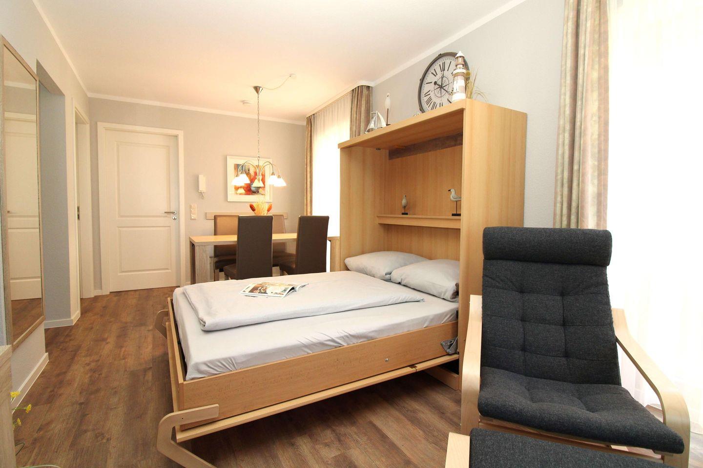 Das moderne und geräumige Wohn-/Esszimmer verfügt über eine separate Sitzecke mit bequemer Couch und Couchtisch, Sessel mit Hocker, einen separaten Esstisch mit 4 Stühlen sowie ein geräumiges Sideboard. Darüber hinaus befindet sich in diesem Zimmer ein bequemes ausklappbares Schrankbett, welches guten Schlafkomfort für 2 weitere Personen bietet. Vom Wohnzimmer aus haben Sie direkten Zugang zu dem ca. 8 m² großen seeseitigen Balkon mit Balkonmöbeln. Hier sitzen Sie entspannt und können das muntere Treiben auf der Ostseeallee verfolgen oder abends bei einem guten Glas Wein die lauen Sommernächte genießen!