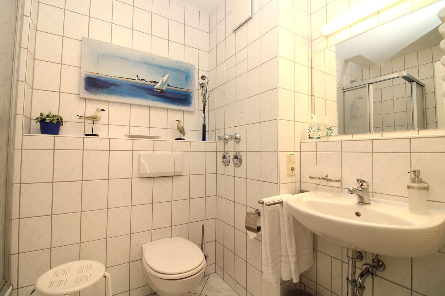 Das freundliche Badezimmer verfügt über eine Dusche, Waschbecken, WC, einen geräumigen Badezimmerschrank, Föhn, Handtuch-Heizkörper sowie ausreichend Ablagemöglichkeiten.
