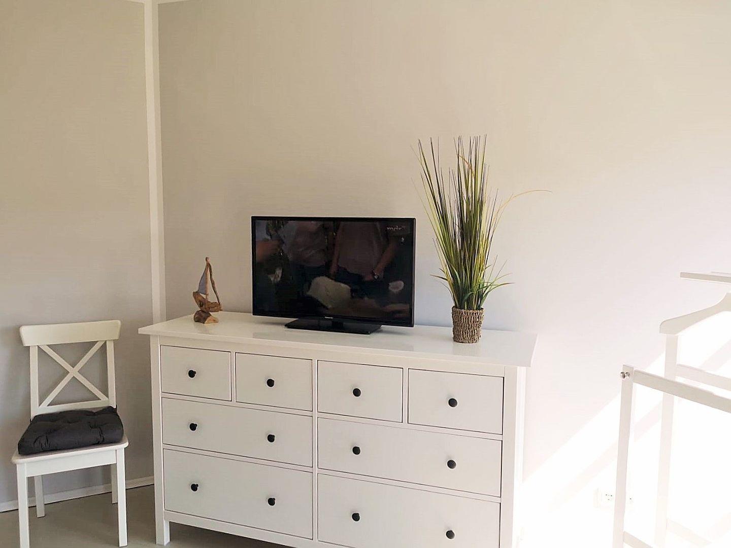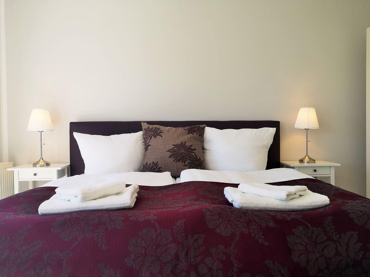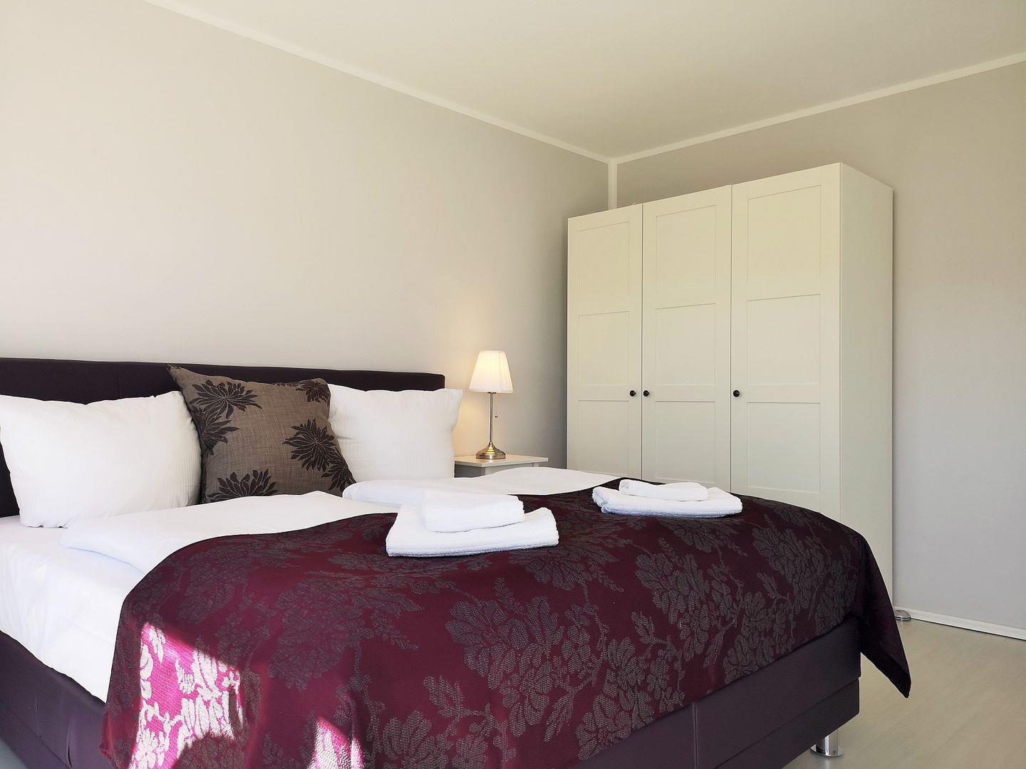 Das moderne und sehr geschmackvoll eingerichtete Schlafzimmer ist mit einem bequemen Box-Spring-Bett, Nachttischen, einem großen Sideboard sowie einem geräumigen Kleiderschrank eingerichtet und verfügt ebenfalls über 2 große bodentiefe Fenster. In diesem Zimmer steht Ihnen ebenfalls ein modernes TV-Gerät zur Verfügung.