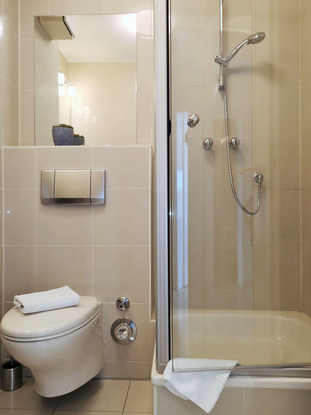 Das helle und freundliche Badezimmer verfügt über eine Dusche, Waschbecken und WC sowie ausreichend Ablagemöglichkeiten.