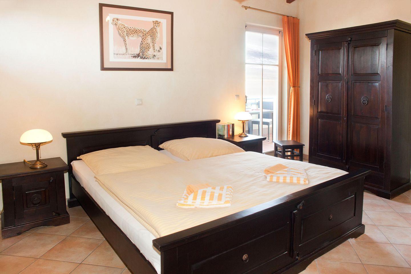 Die 2 gemütlichen und freundlichen Schlafzimmer (1 x im 1. OG sowie 1 x im 2. OG) sind jeweils mit bequemen Doppelbetten, Nachttischen sowie einem geräumigen Kleiderschrank eingerichtet. Das Schlafzimmer unten hat einen Zugang zum dortigen Balkon, das Schafzimmer oben hat einen separaten Zugang zur dortigen Dachterrasse.