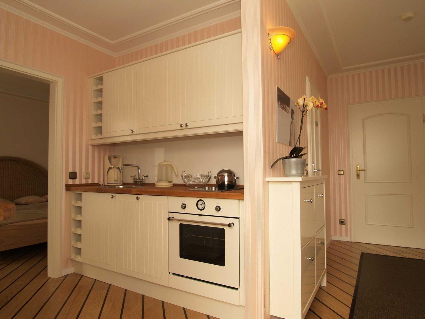 Der halb offene Küchenbereich beinhaltet eine voll ausgestattete Einbauküchenzeile mit 2-Platten-Ceran-Kochfeld, Backofen, Kühlschrank mit Gefrierfach, Geschirrspülmaschine, Kaffeemaschine, Wasserkocher und Toaster. Die Küche ist mit Geschirr, Gläsern, Besteck und Töpfen bestens und ausreichend ausgestattet.