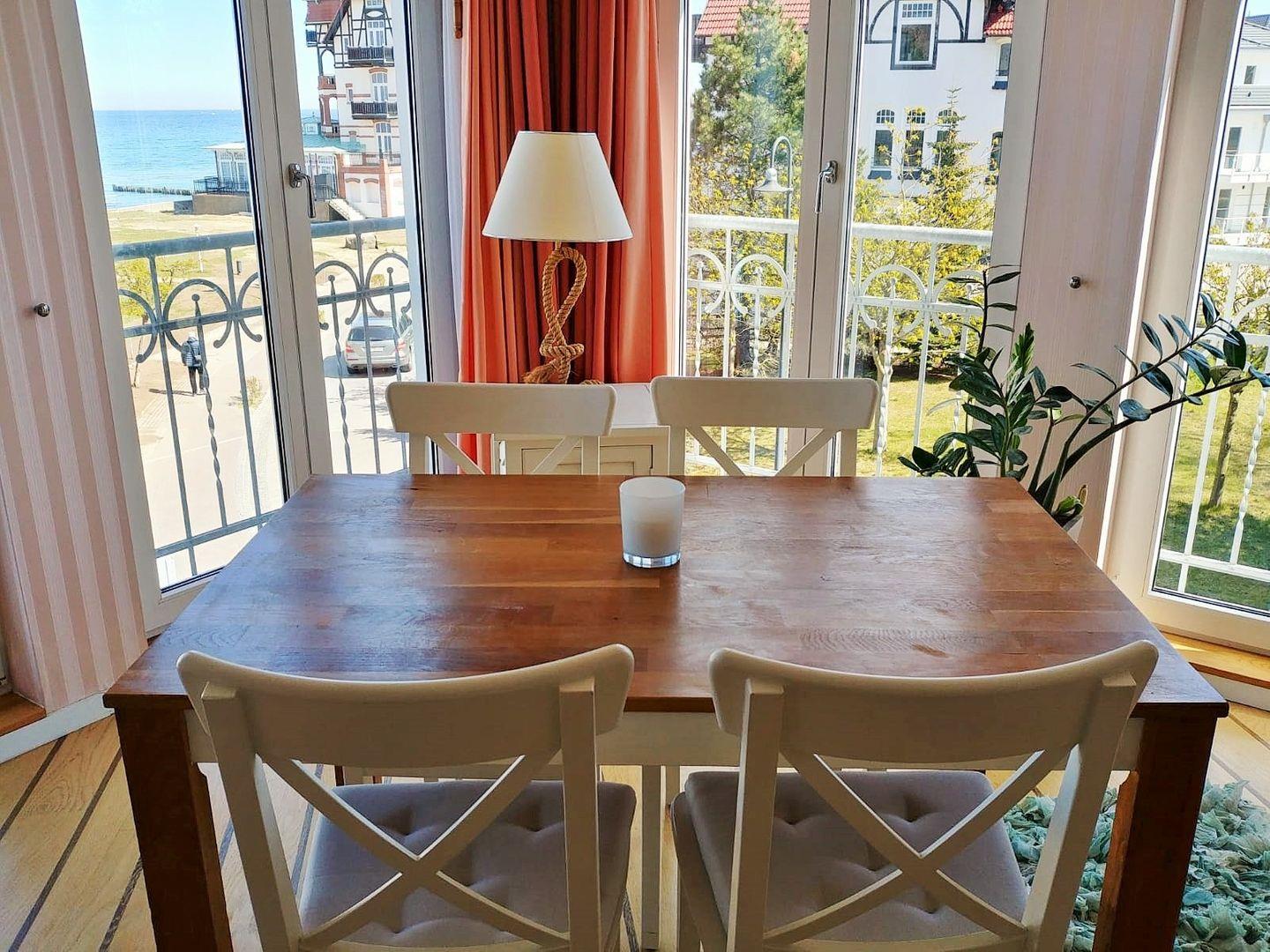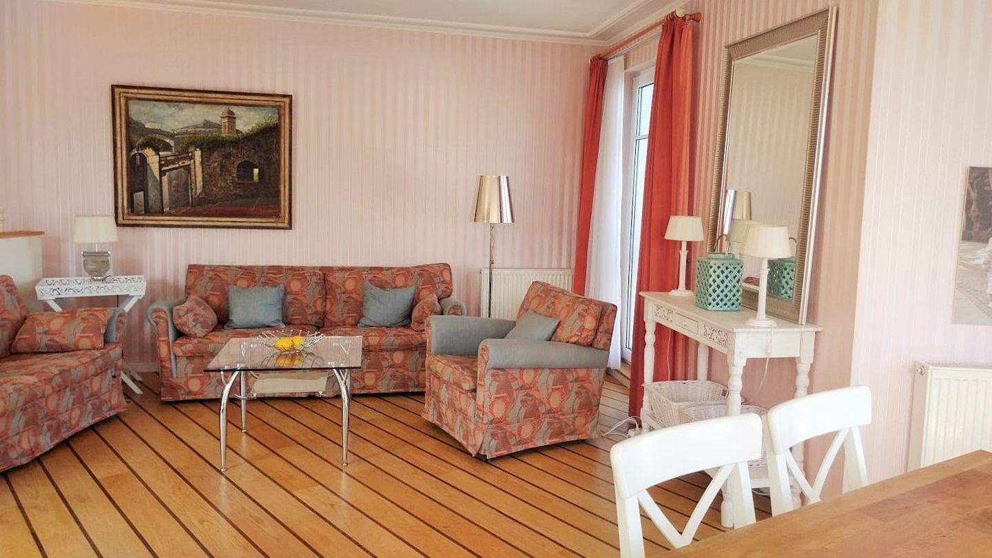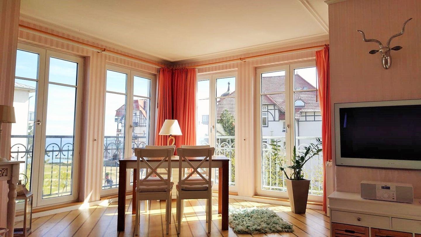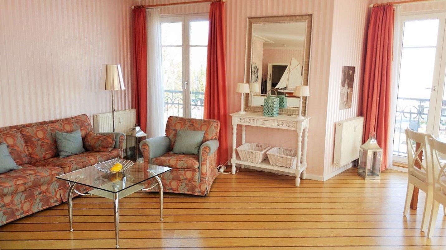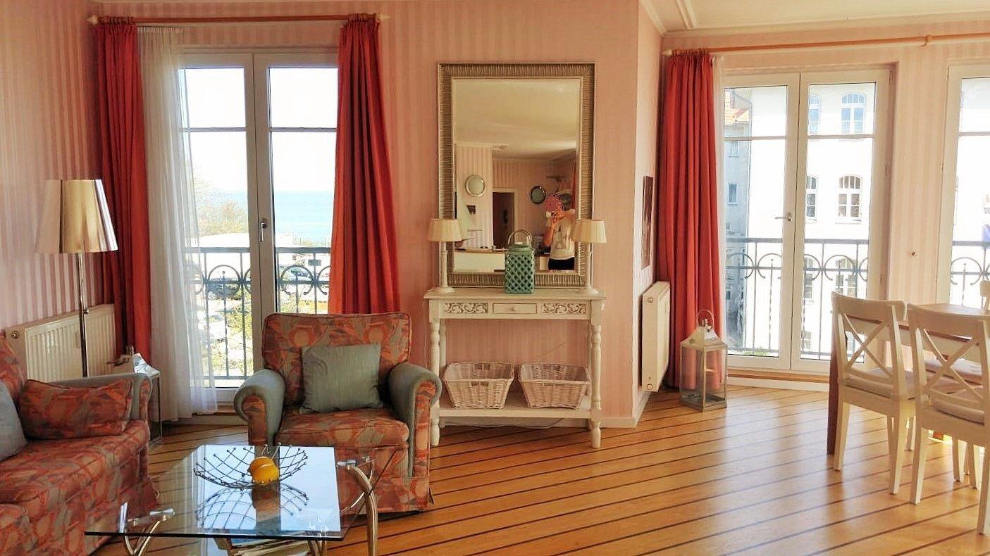 Das sehr großzügige und lichtdurchflutete Wohn-/Esszimmer verfügt über eine separate Sitzgruppe mit 2 bequemen Couchen, Sessel und Couchtisch, eine separate Essgruppe im „Turmzimmer“ sowie verschiedene Sideboards und Schränke. Vom Wohnzimmer aus haben Sie direkten Zugang zu dem herrlichen ca. 15 m² großen und sonnigen Balkon (nach Osten und Süden ausgerichtet) mit Balkonmöbeln - hier sitzen Sie entspannt und gemütlich mit traumhaftem Blick auf das weite Meer und können abends bei einem guten Glas Wein in Ruhe die lauen Sommernächte genießen!