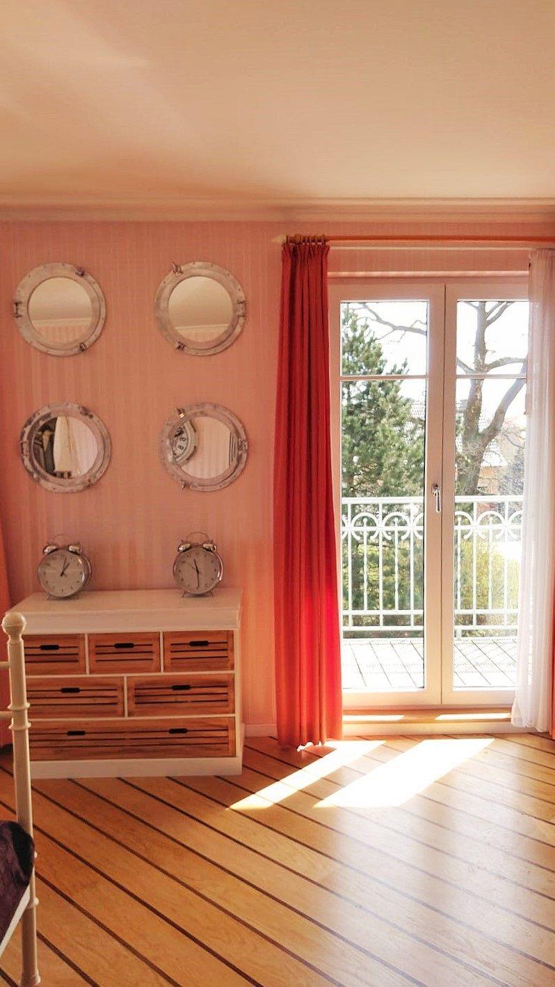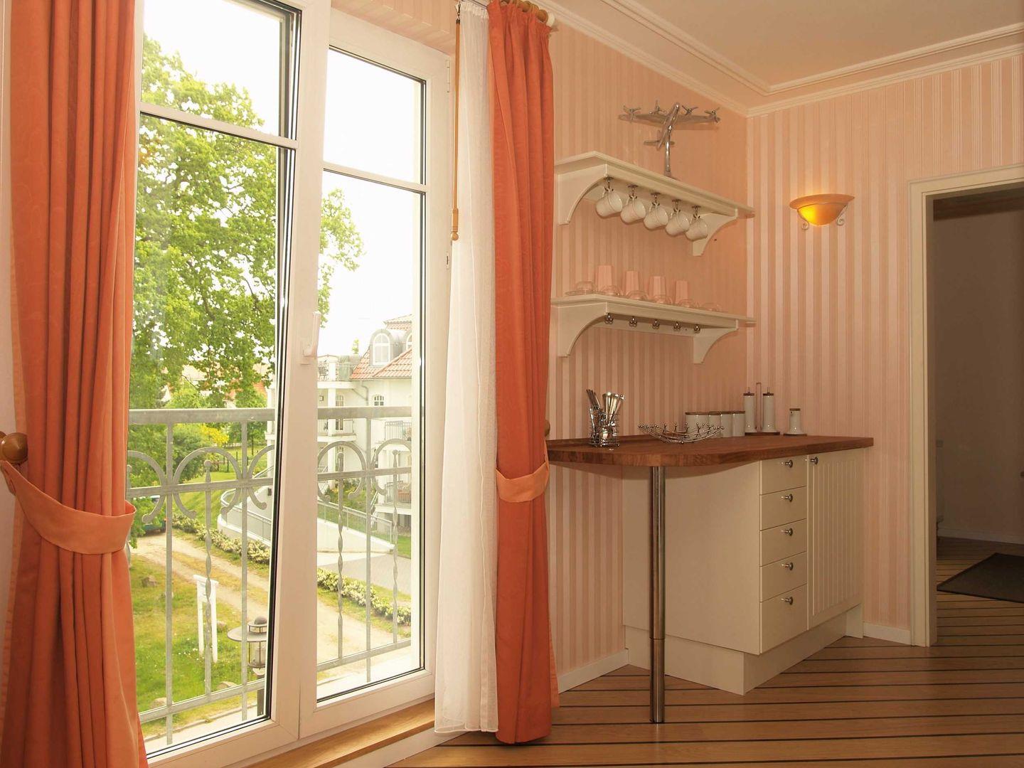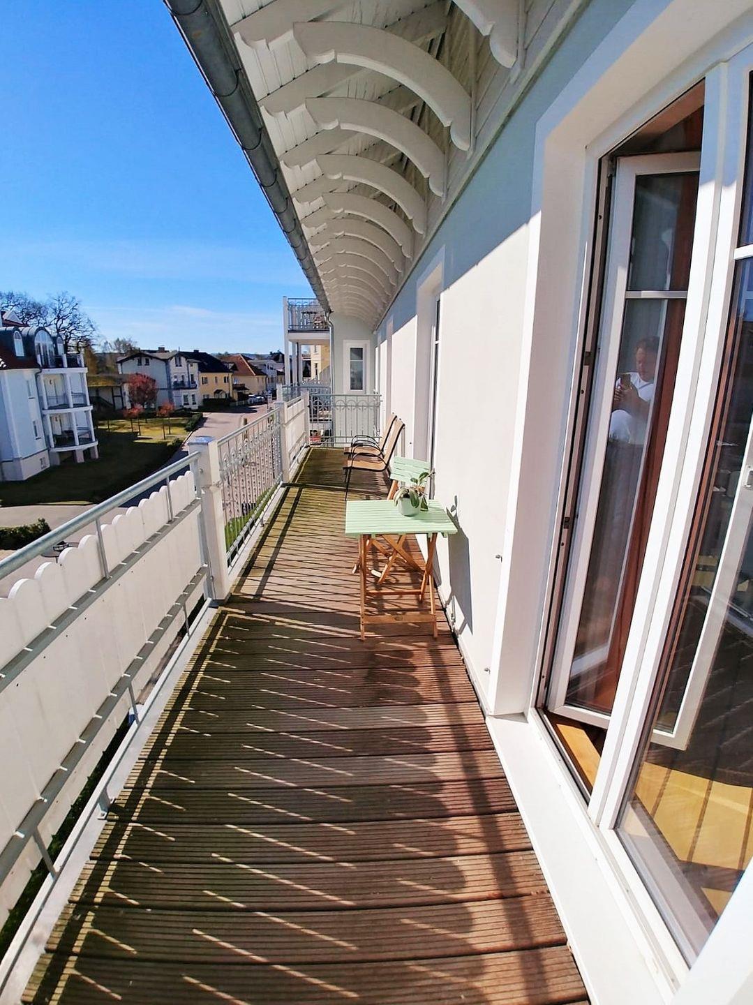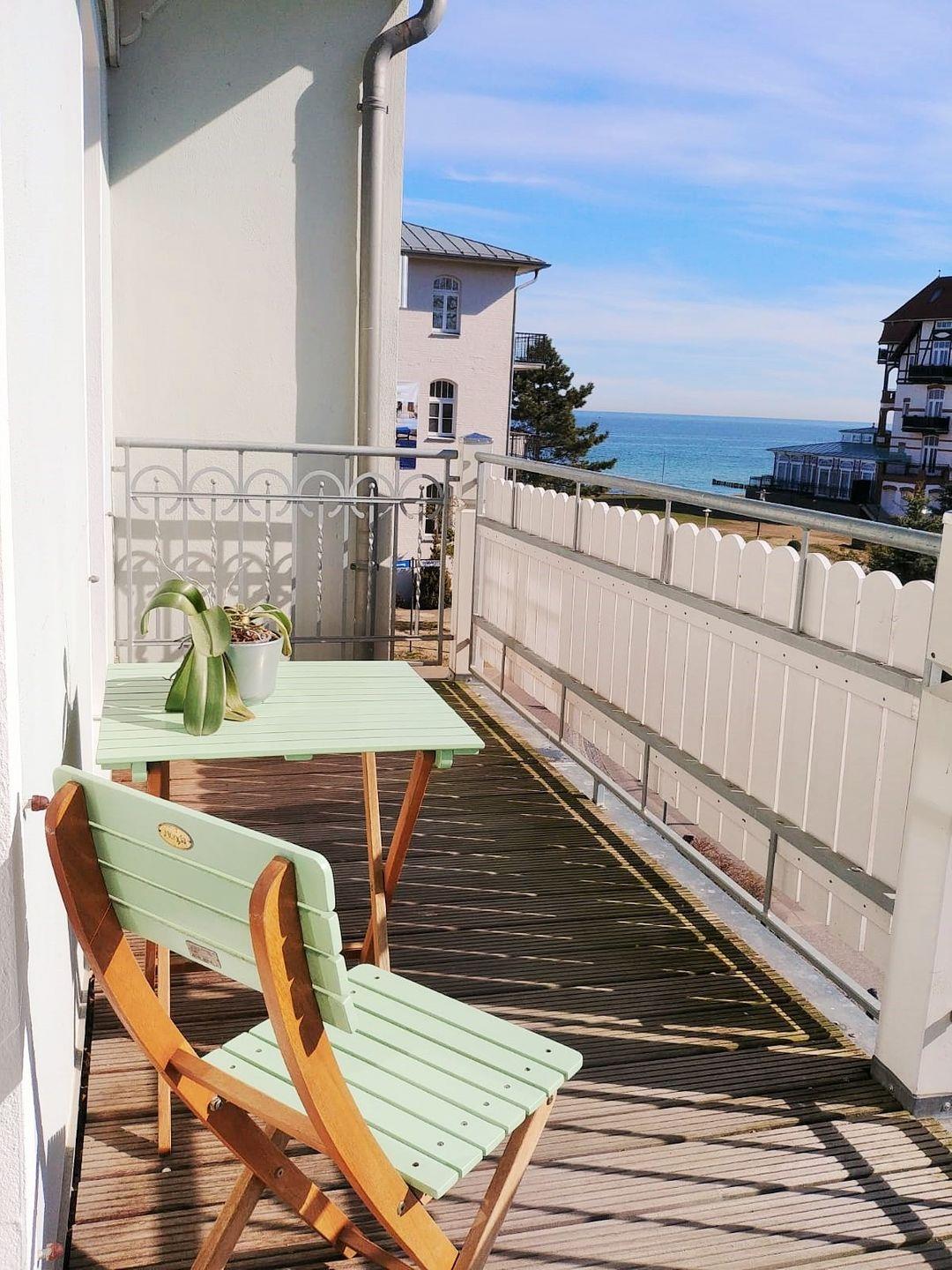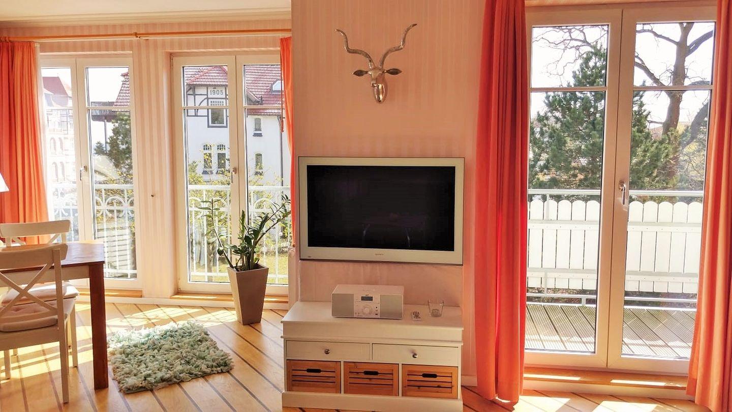 Das sehr großzügige und lichtdurchflutete Wohn-/Esszimmer verfügt über eine separate Sitzgruppe mit 2 bequemen Couchen, Sessel und Couchtisch, eine separate Essgruppe im „Turmzimmer“ sowie verschiedene Sideboards und Schränke. Vom Wohnzimmer aus haben Sie direkten Zugang zu dem herrlichen ca. 15 m² großen und sonnigen Balkon (nach Osten und Süden ausgerichtet) mit Balkonmöbeln - hier sitzen Sie entspannt und gemütlich mit traumhaftem Blick auf das weite Meer und können abends bei einem guten Glas Wein in Ruhe die lauen Sommernächte genießen!