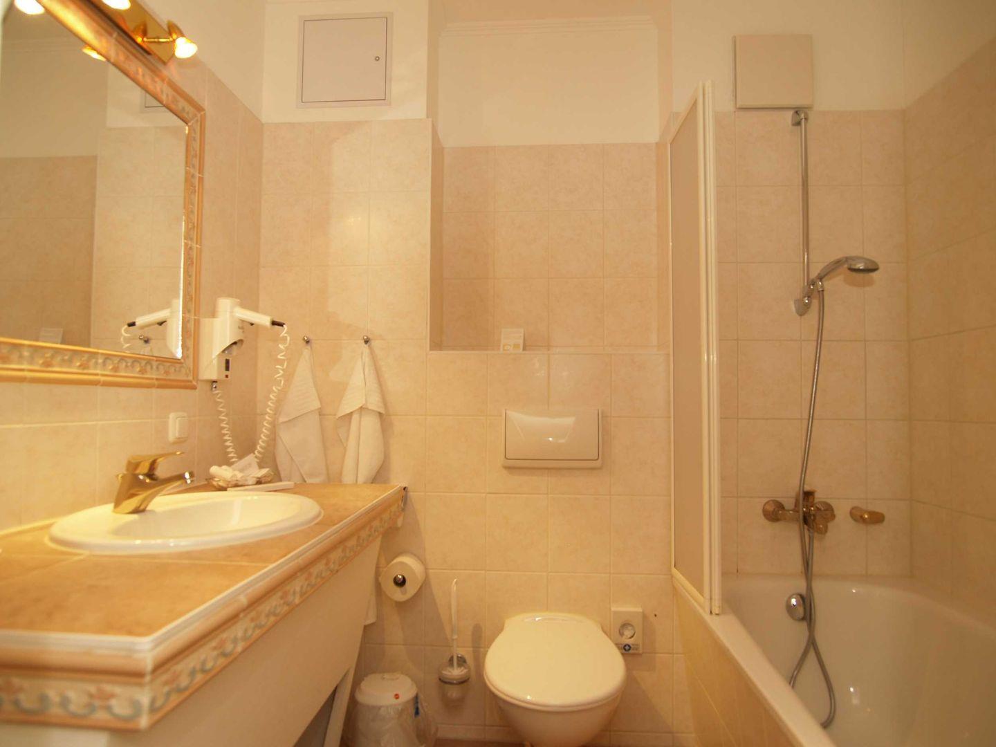 Das freundliche und mediterran anmutende Badezimmer verfügt über eine Badewanne (mit Duschmöglichkeit), Waschbecken und WC, Föhn, Radio sowie ausreichend Ablage-möglichkeiten.