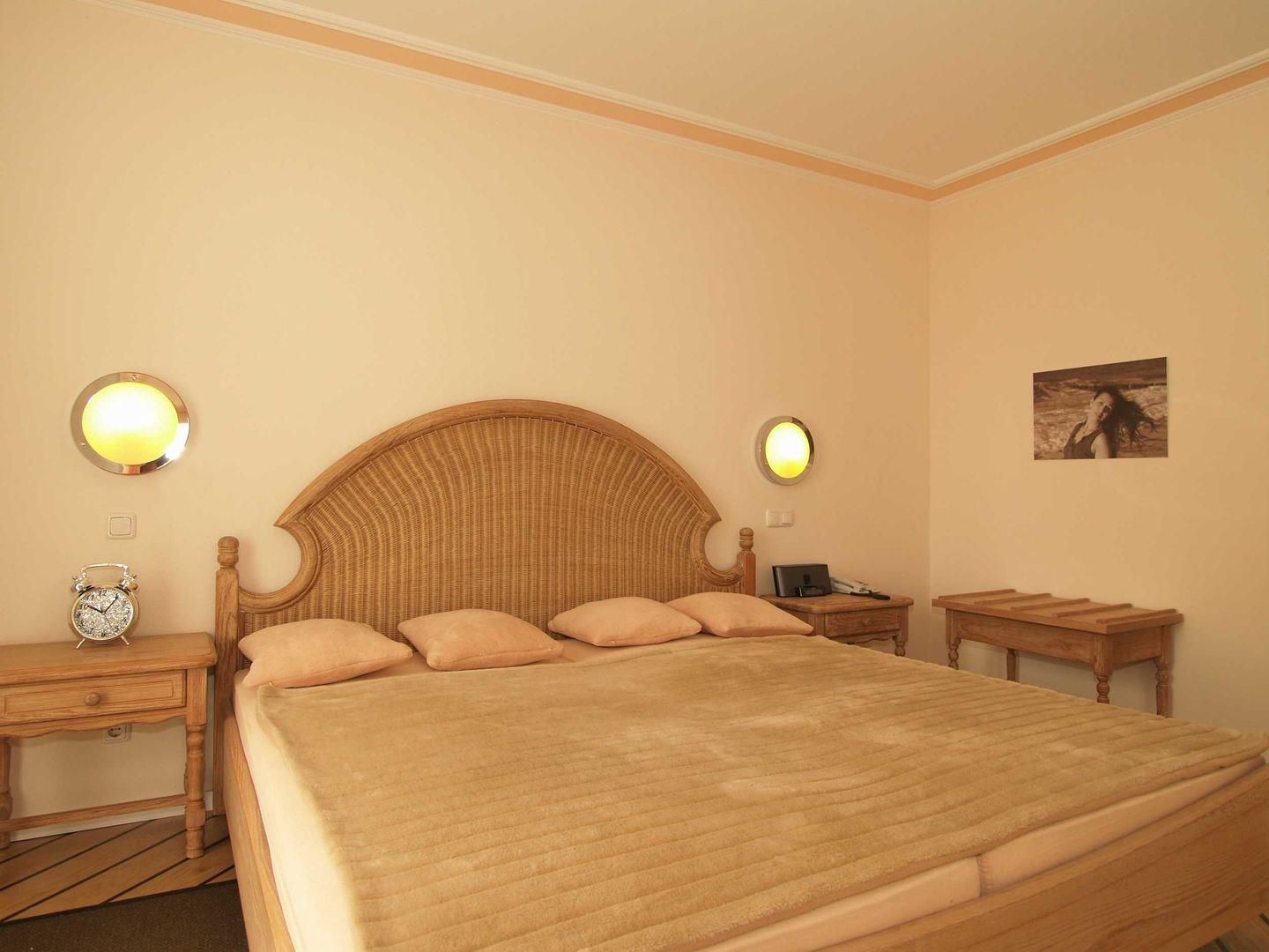 Das sehr gemütliche und großzügige Schlafzimmer ist mit einem bequemen Doppelbett, Nachttischen, Kleiderschrank sowie 2 Kommoden eingerichtet und hat ebenfalls einen direkten Zugang zum Balkon. Zu Ihrer Unterhaltung steht Ihnen auch hier ein weiteres zusätzliches TV-Gerät zur Verfügung.
