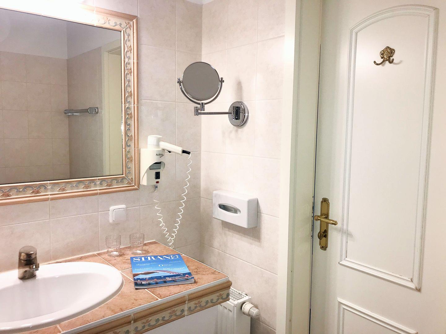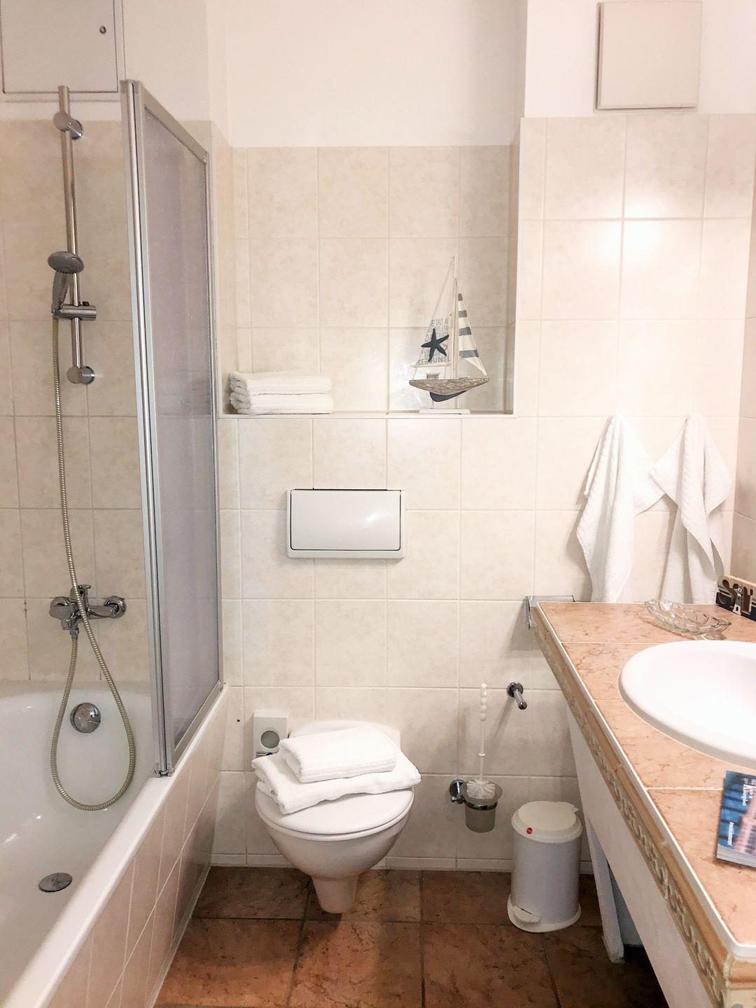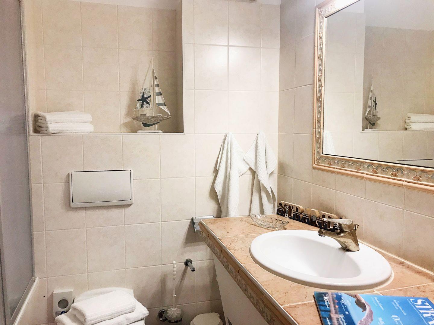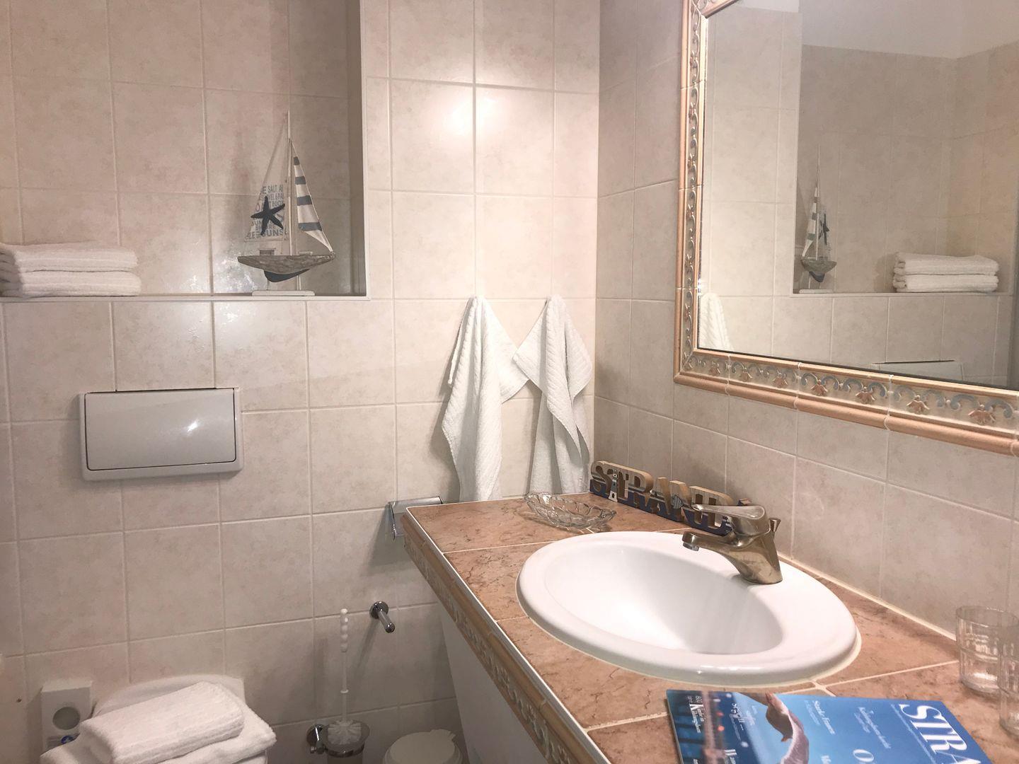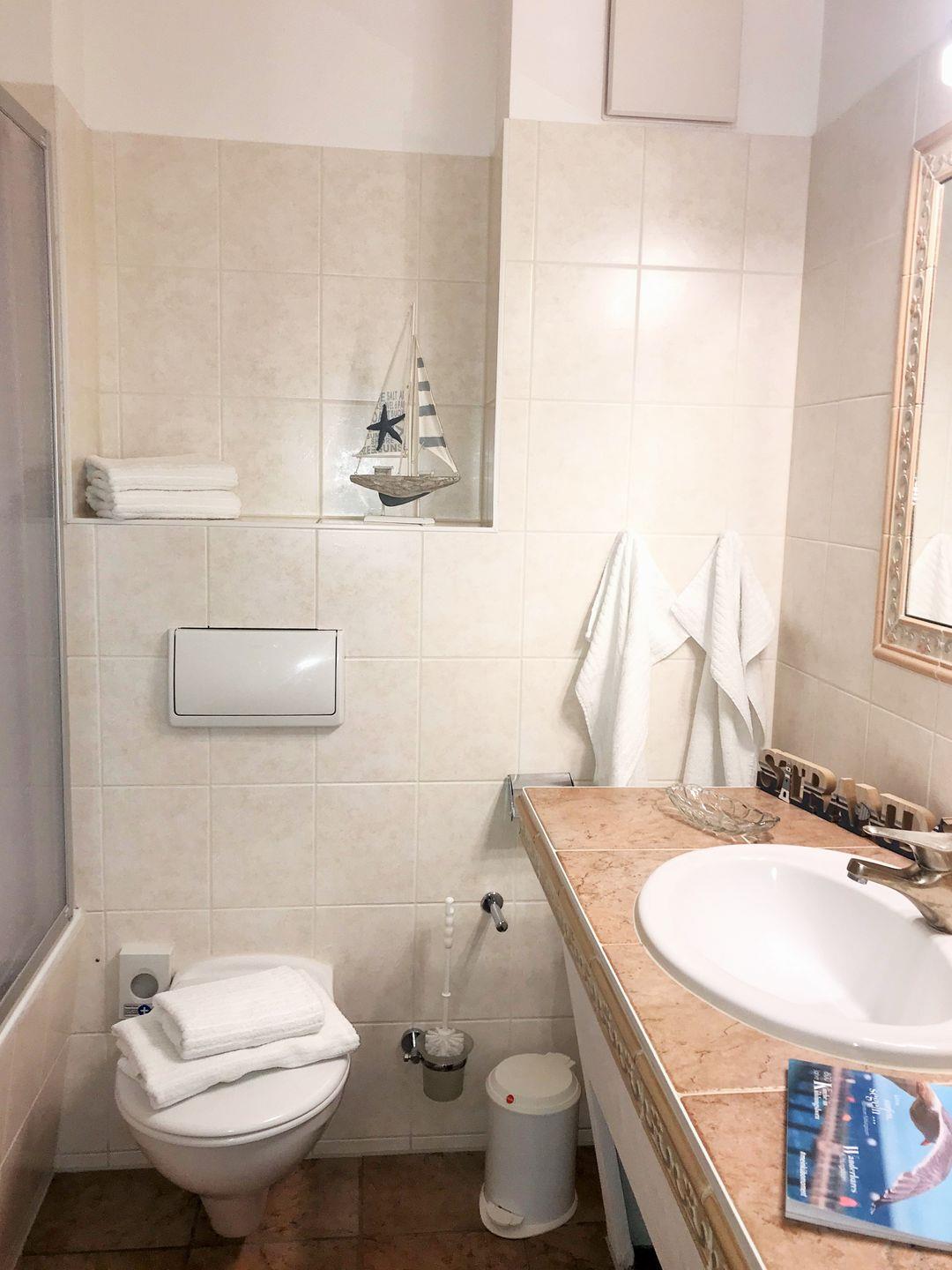 Das freundliche und mediterran anmutende Badezimmer verfügt über eine Badewanne mit Duschabtrennung, Waschbecken, WC, Kosmetikspiegel, Föhn sowie ausreichend Ablagemöglichkeiten.