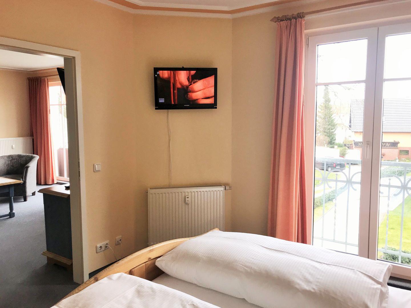Das gemütliche Schlafzimmer ist mit einem bequemen Doppelbett, Nachttischen, einem geräumigen Kleiderschrank sowie einer Kofferablage eingerichtet und verfügt über ein zusätzliches modernes Flachbildschirm-TV-Gerät.
