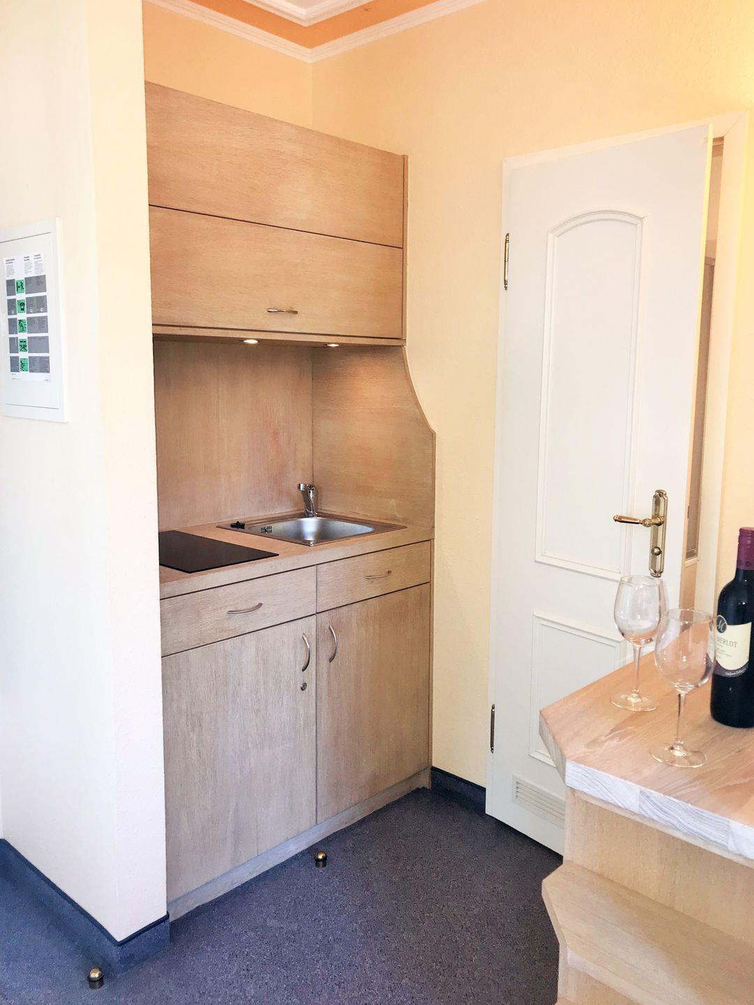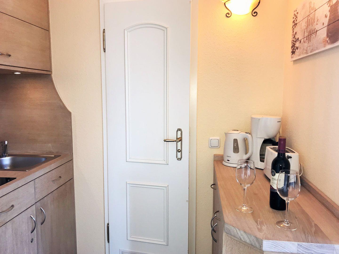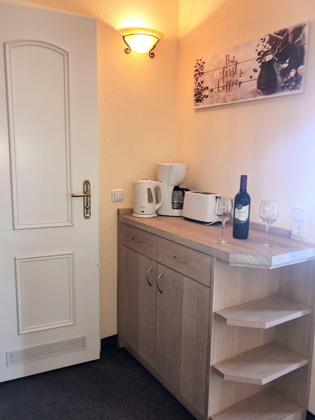 Die offene Pantry-Küche beinhaltet eine Einbauküchenzeile mit 2-Platten-Ceran-Kochfeld, Kühlschrank, Kaffeemaschine, Wasserkocher und Toaster. Die Küche ist mit Geschirr, Gläsern, Besteck und Töpfen vollständig ausgestattet.