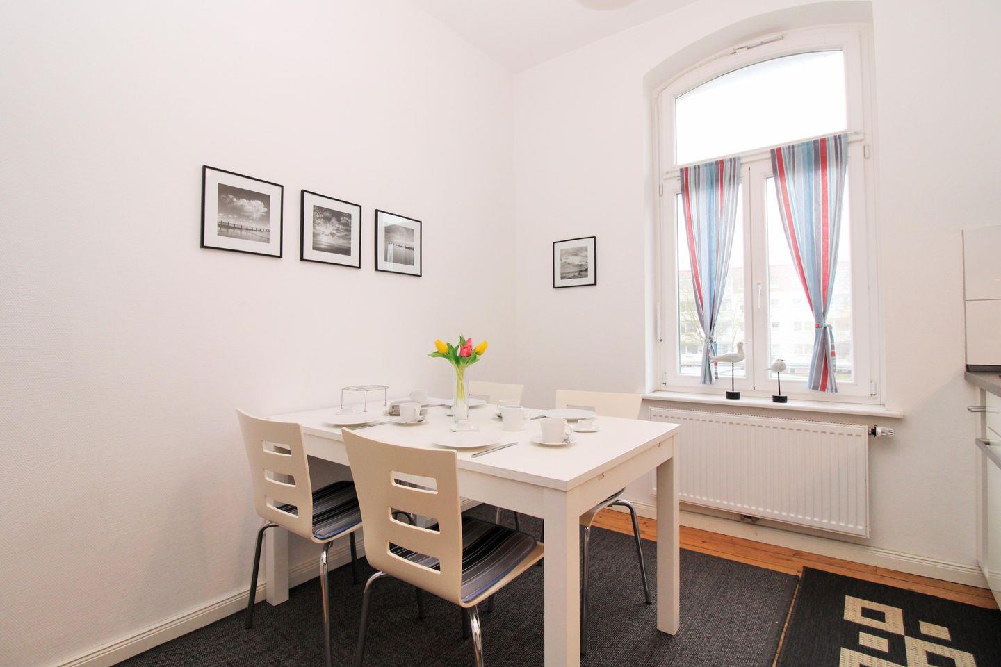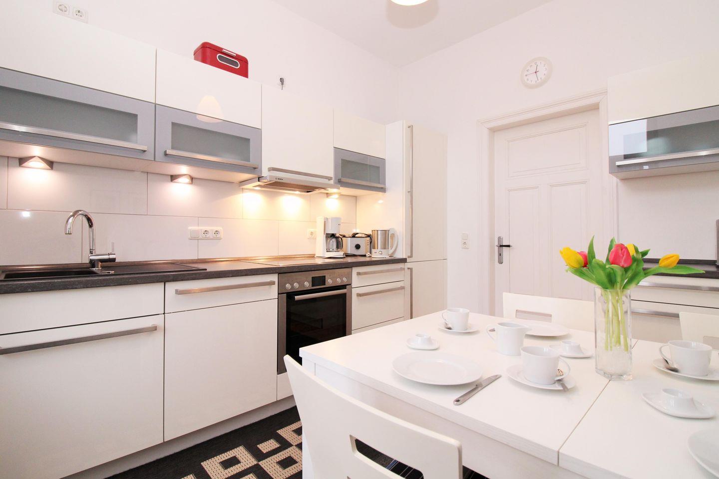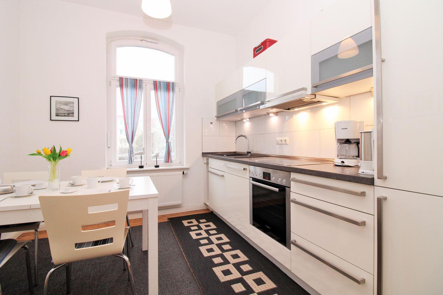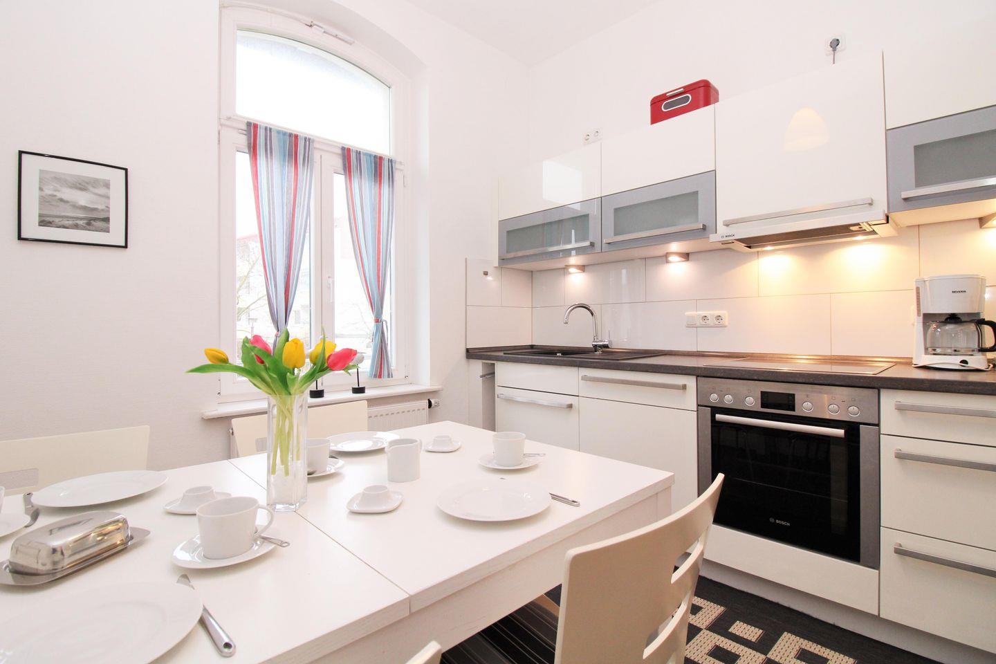 Die separate und geräumige Küche mit Essbereich beinhaltet eine voll ausgestattete Einbauküchenzeile mit 4-Platten-Ceran-Kochfeld, Backofen, Dunstabzug, Mikrowelle, Kühlschrank mit Gefrierfach, Geschirrspülmaschine, Kaffeemaschine, Wasserkocher und Toaster. Darüber hinaus ist die Küche mit einem separaten Esstisch mit 4 Stühlen eingerichtet. Die Küche ist mit Geschirr, Gläsern, Besteck und Töpfen komplett ausgestattet.