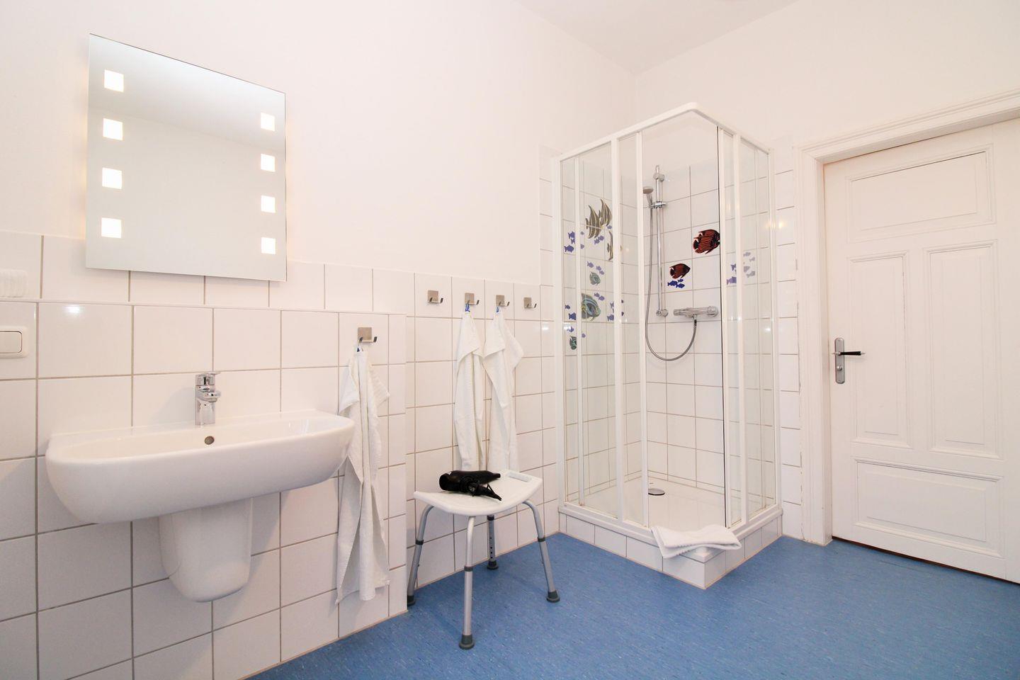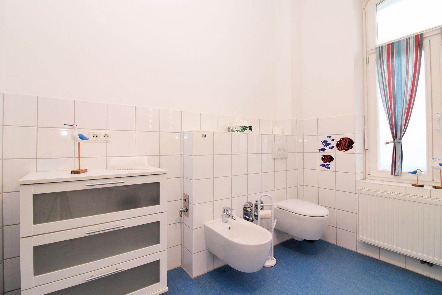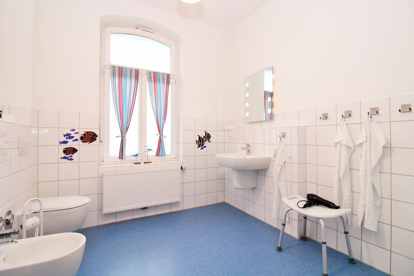 Das moderne und mit farbenfrohen, maritimen Dekorfliesen ausgestattete Badezimmer (mit Tageslicht / Fenster) verfügt über eine Dusche mit niedrigem Einstieg, Waschbecken, WC, Bidet, Badezimmer-Schrank, Hocker, Föhn sowie ausreichend Ablagemöglichkeiten.