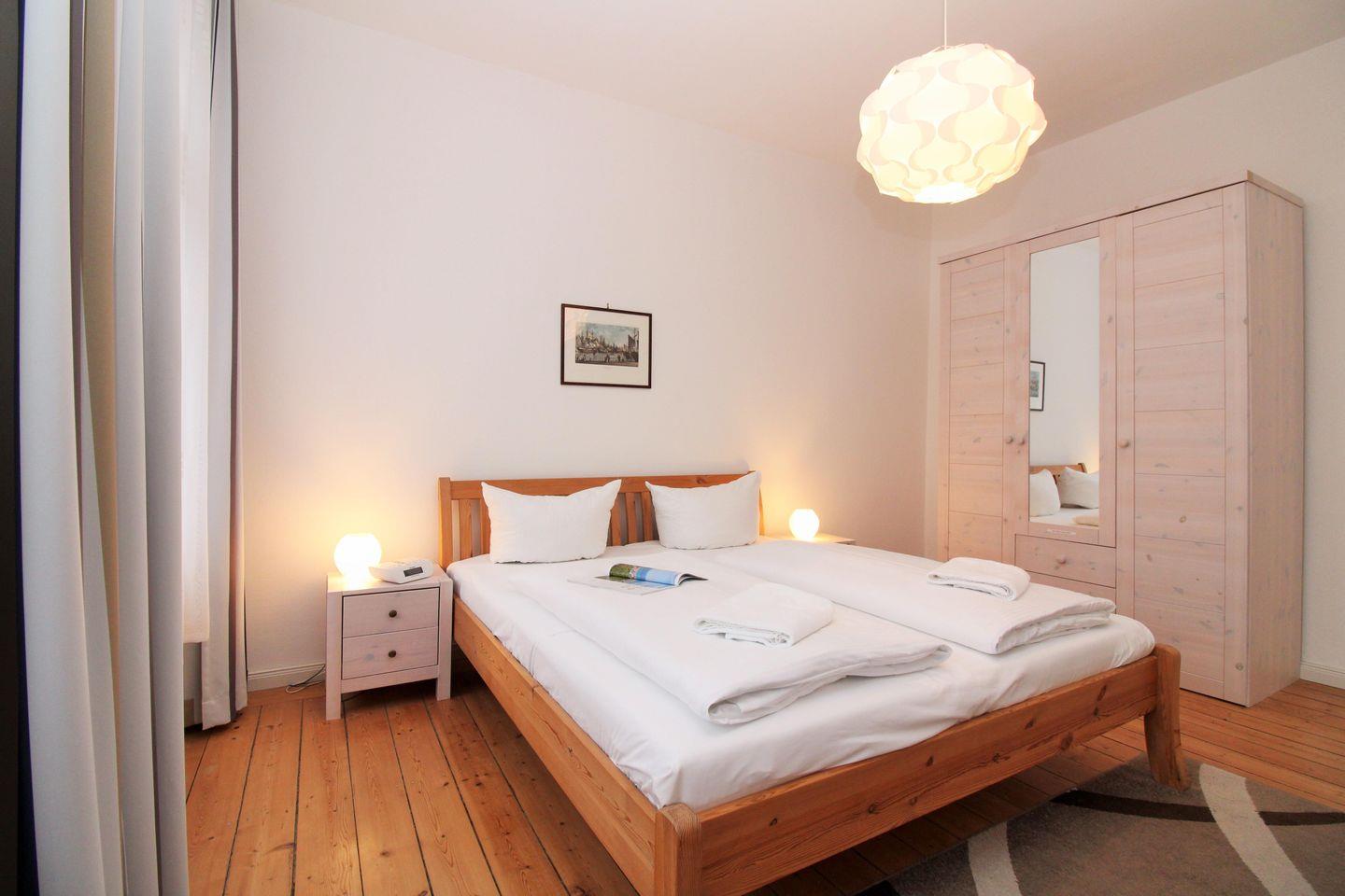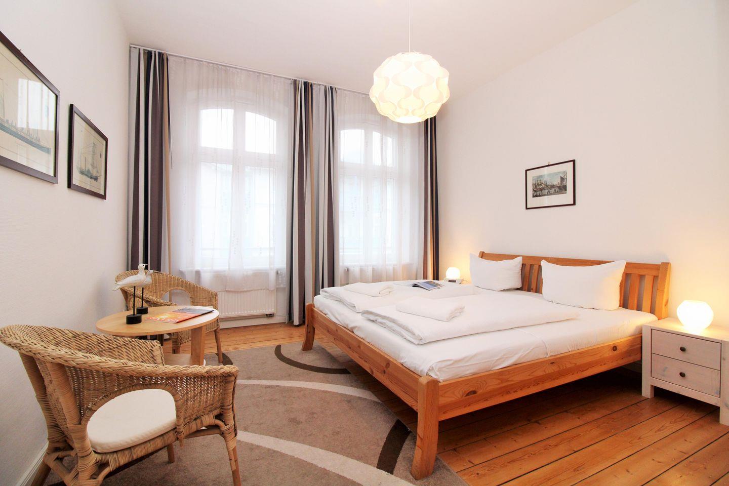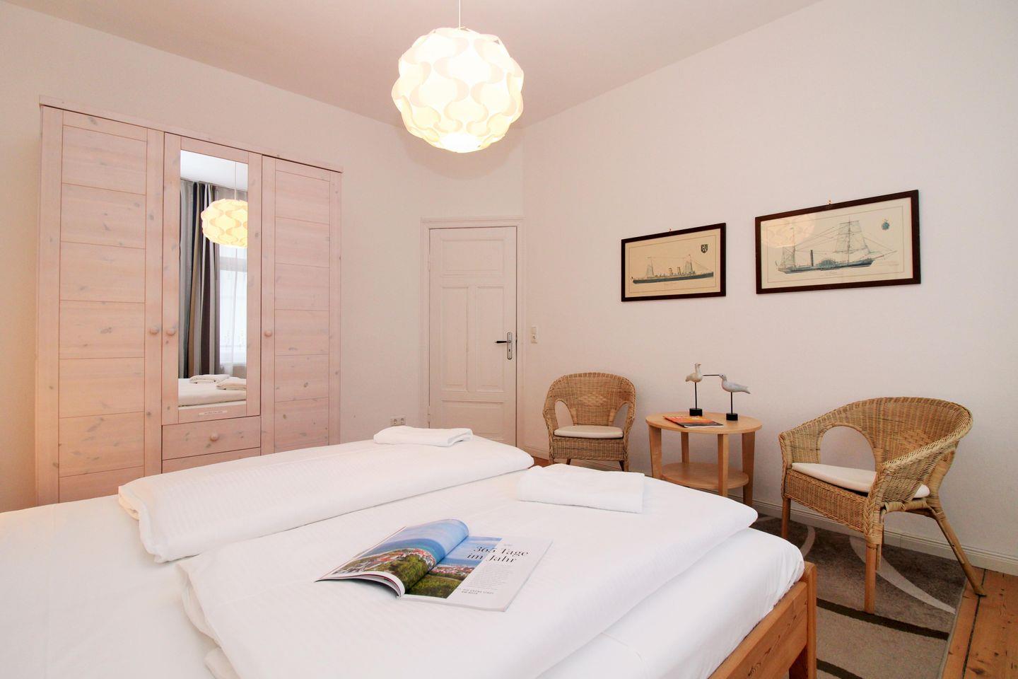 Das freundliche und gemütliche 1. Schlafzimmer ist mit einem bequemen Doppelbett (2 x 90 cm x 200 cm), Nachttischen mit Nachttischlampen, einem geräumigen Kleiderschrank sowie einer kleinen Sitzgruppe bestehend aus 2 Korbsesseln mit einem kleinen Tisch eingerichtet. Für einen hohen Schlafkomfort sorgen die vorhandenen Verdunkelungsvorhänge an beiden Fenstern.