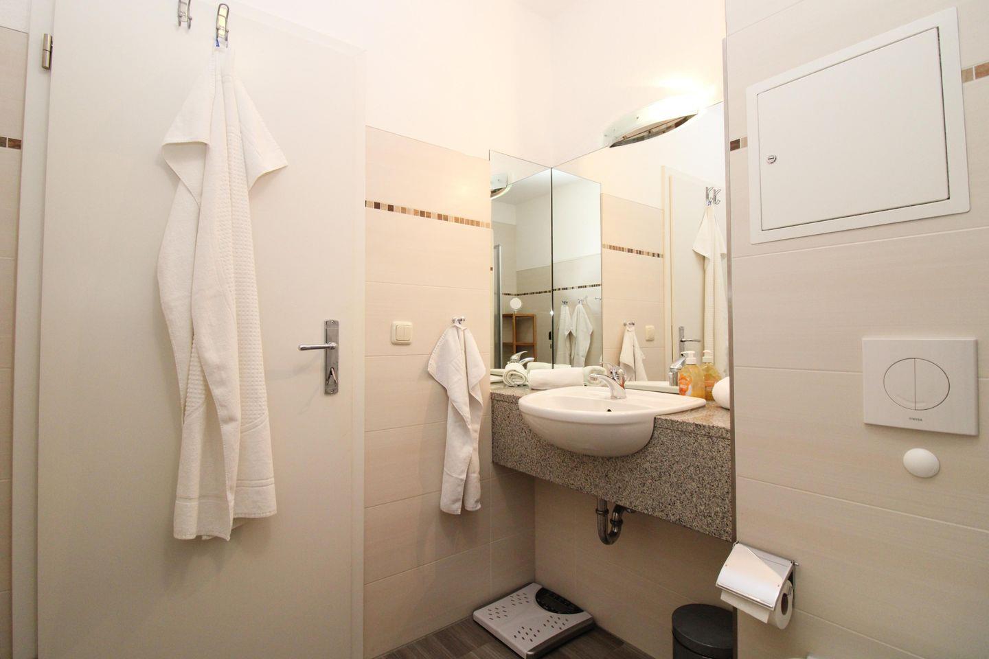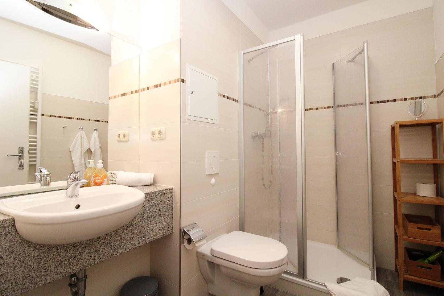 Das moderne Badezimmer verfügt über eine Dusche mit niedrigem Einstieg, Waschbecken, WC, Kosmetikspiegel, Föhn, Handtuch-Heizkörper sowie ausreichend Ablagemöglichkeiten.