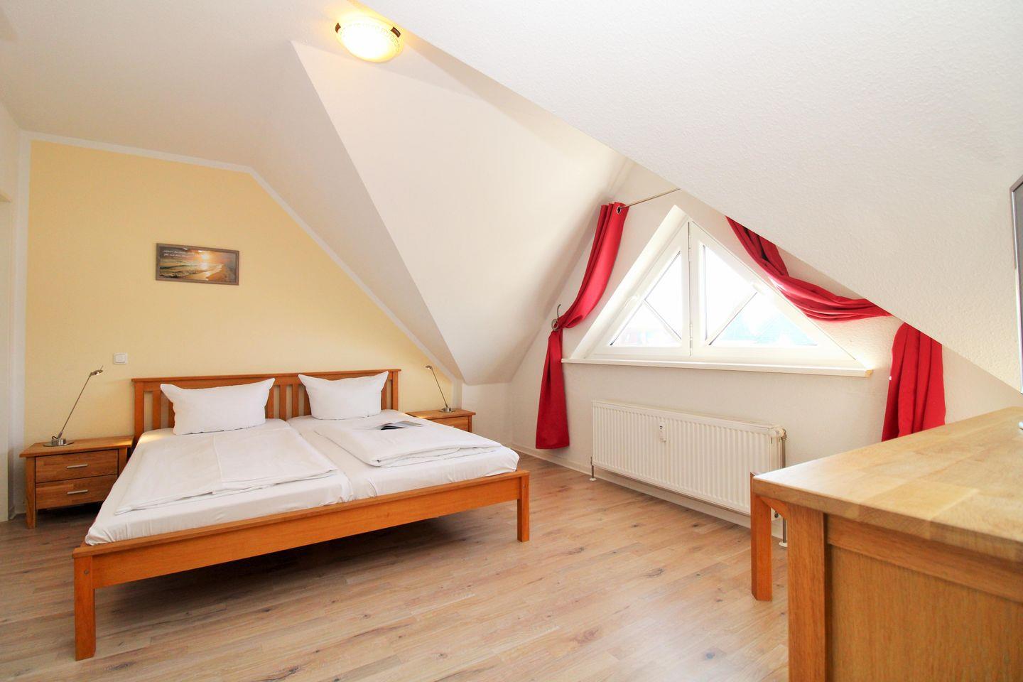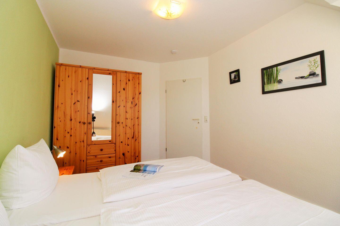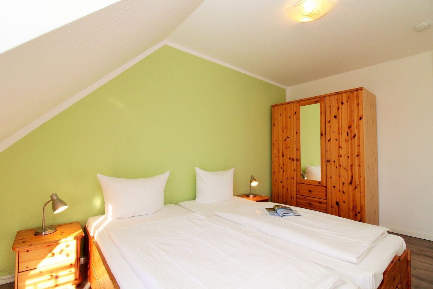 Das gemütliche 1. Schlafzimmer ist mit einem bequemen Doppelbett, Nachttischen, einem Kleiderschrank, einer Wäschekommode sowie einem kleinen Tisch eingerichtet. Darüber hinaus steht Ihnen auch hier ein TV-Gerät zur Verfügung.
