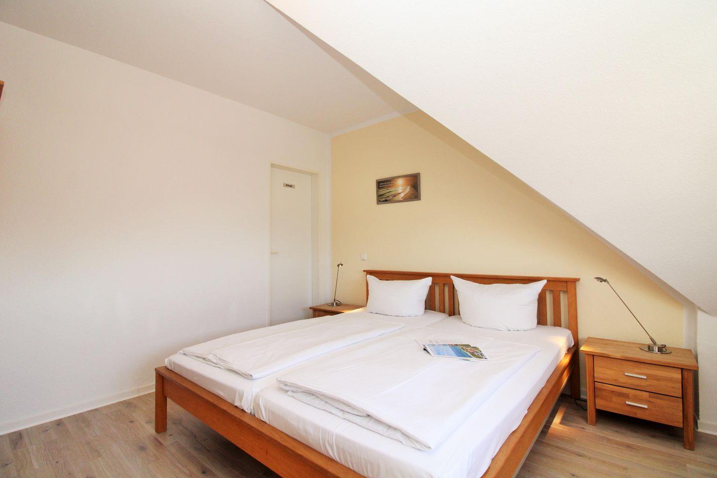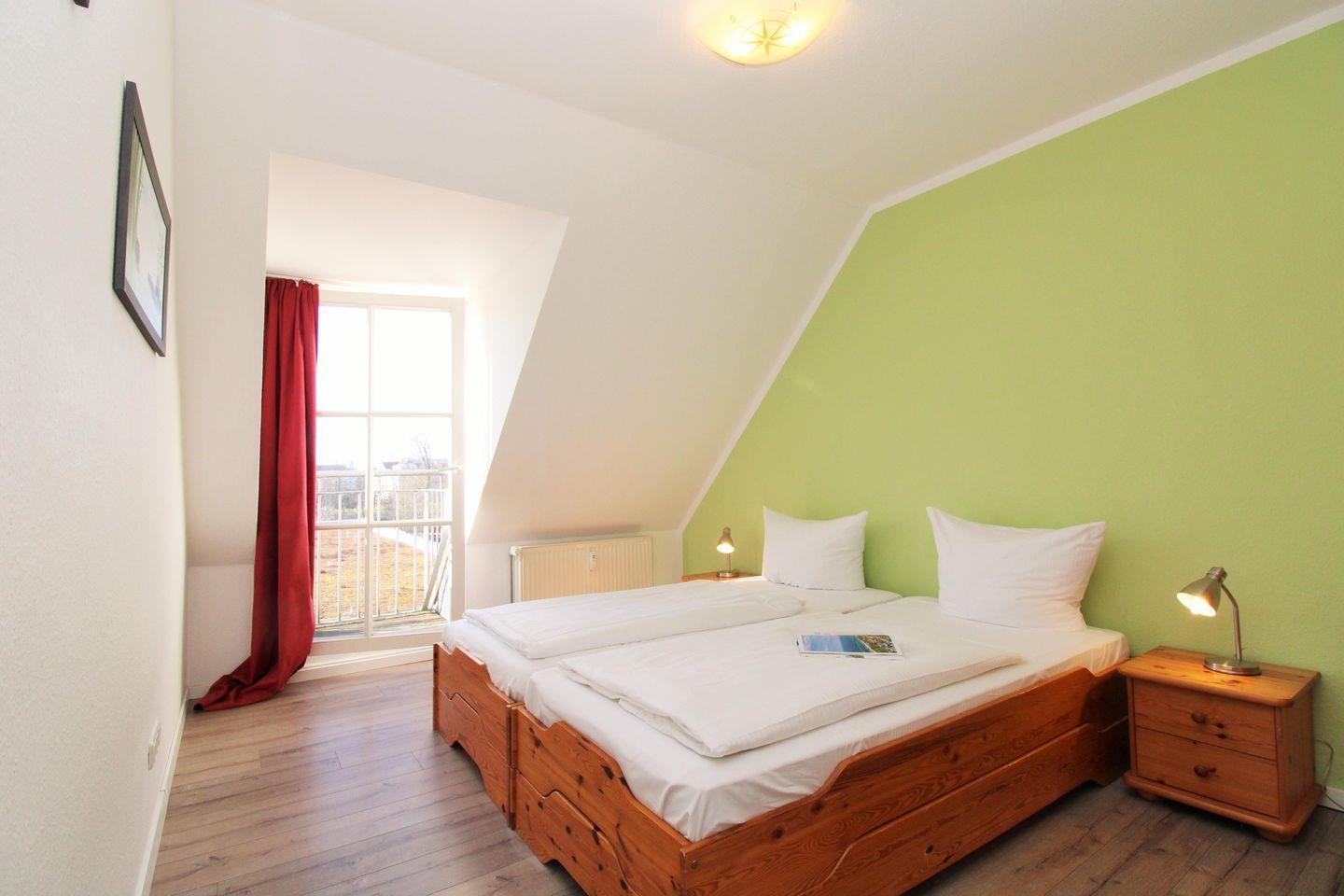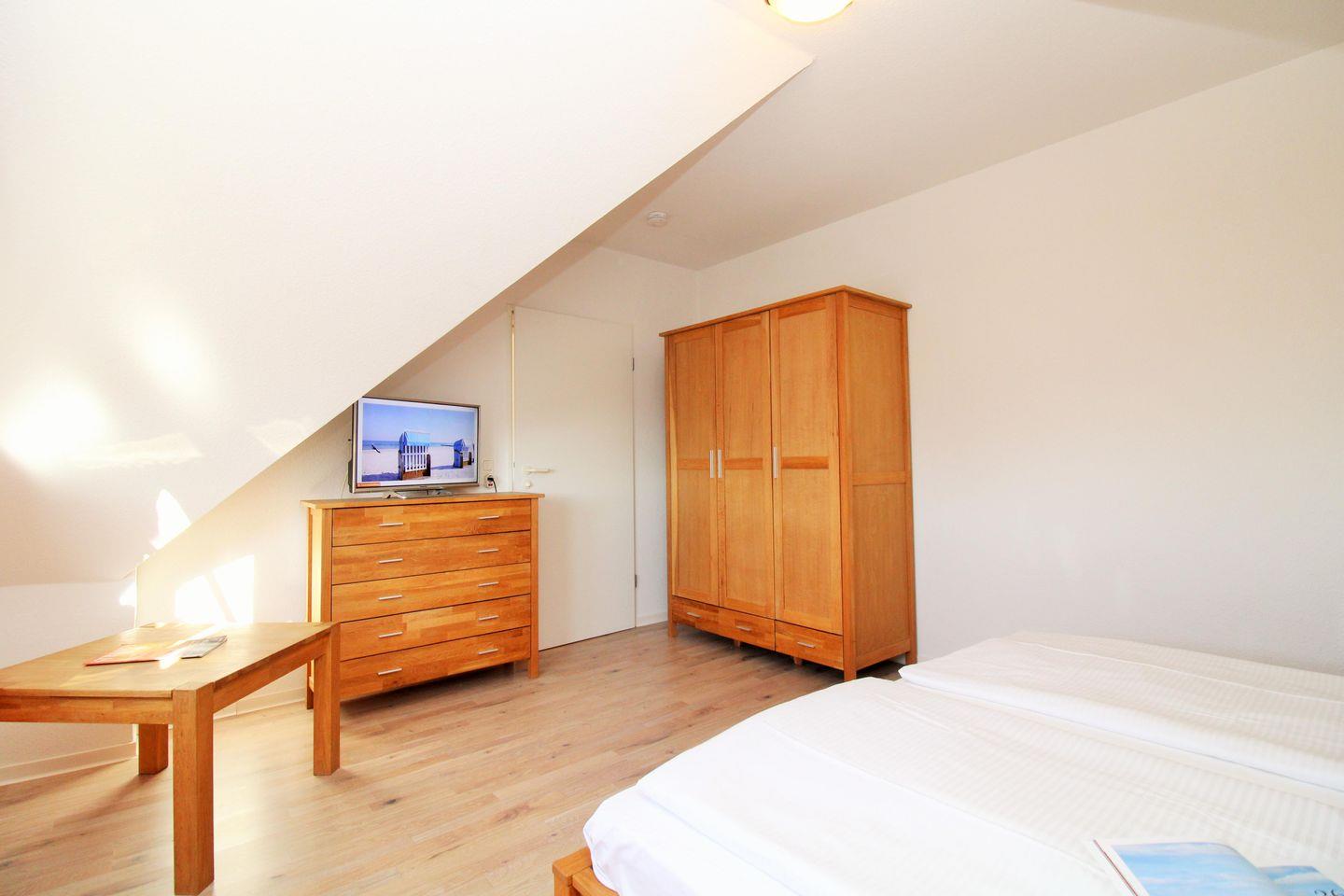 Das gemütliche 1. Schlafzimmer ist mit einem bequemen Doppelbett, Nachttischen, einem Kleiderschrank, einer Wäschekommode sowie einem kleinen Tisch eingerichtet. Darüber hinaus steht Ihnen auch hier ein TV-Gerät zur Verfügung.