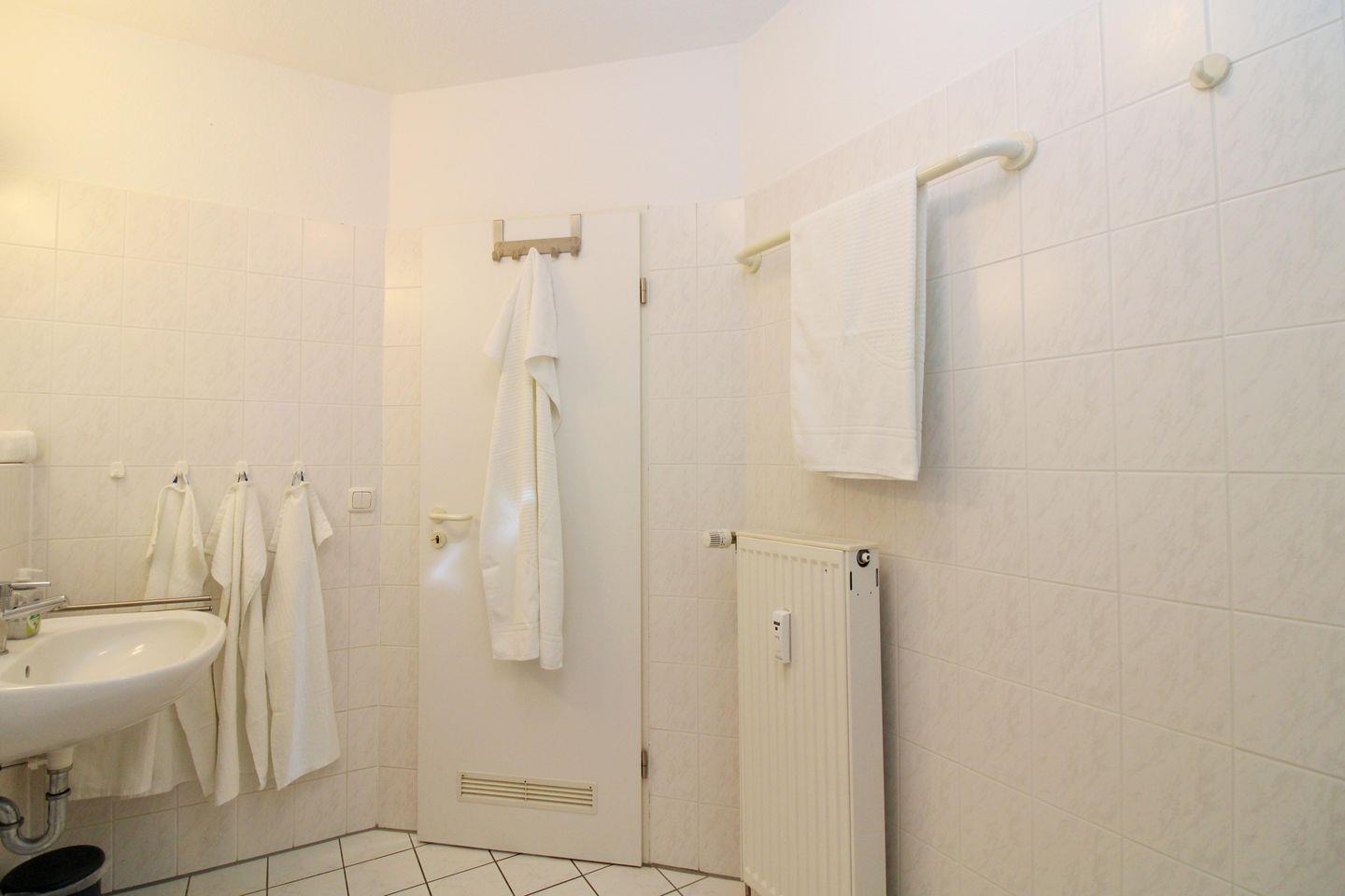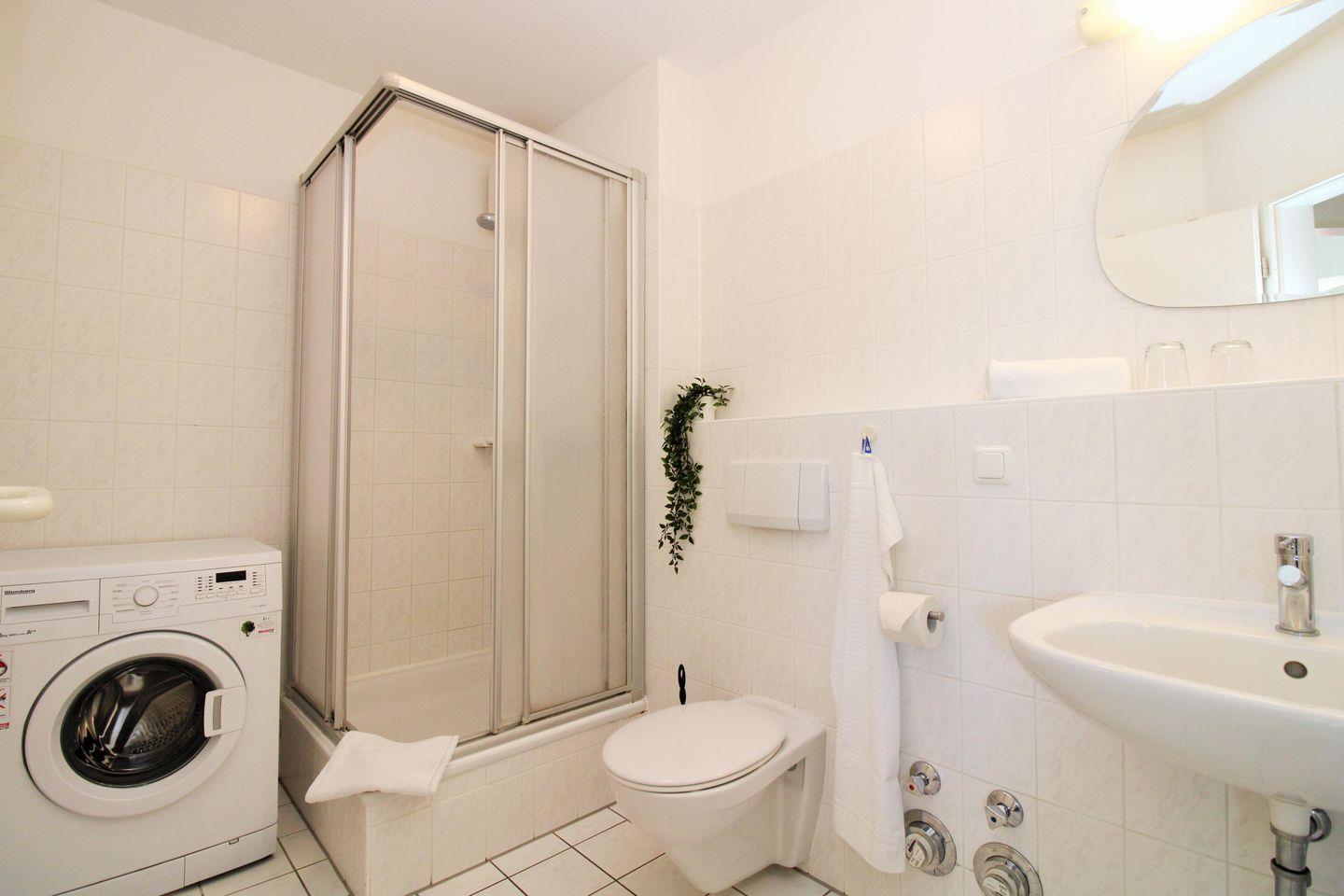 Zum Waschen Ihrer Urlaubsgarderobe befindet sich im Badezimmer auch eine Waschmaschine, die von den Gästen kostenfrei benutzt werden kann.