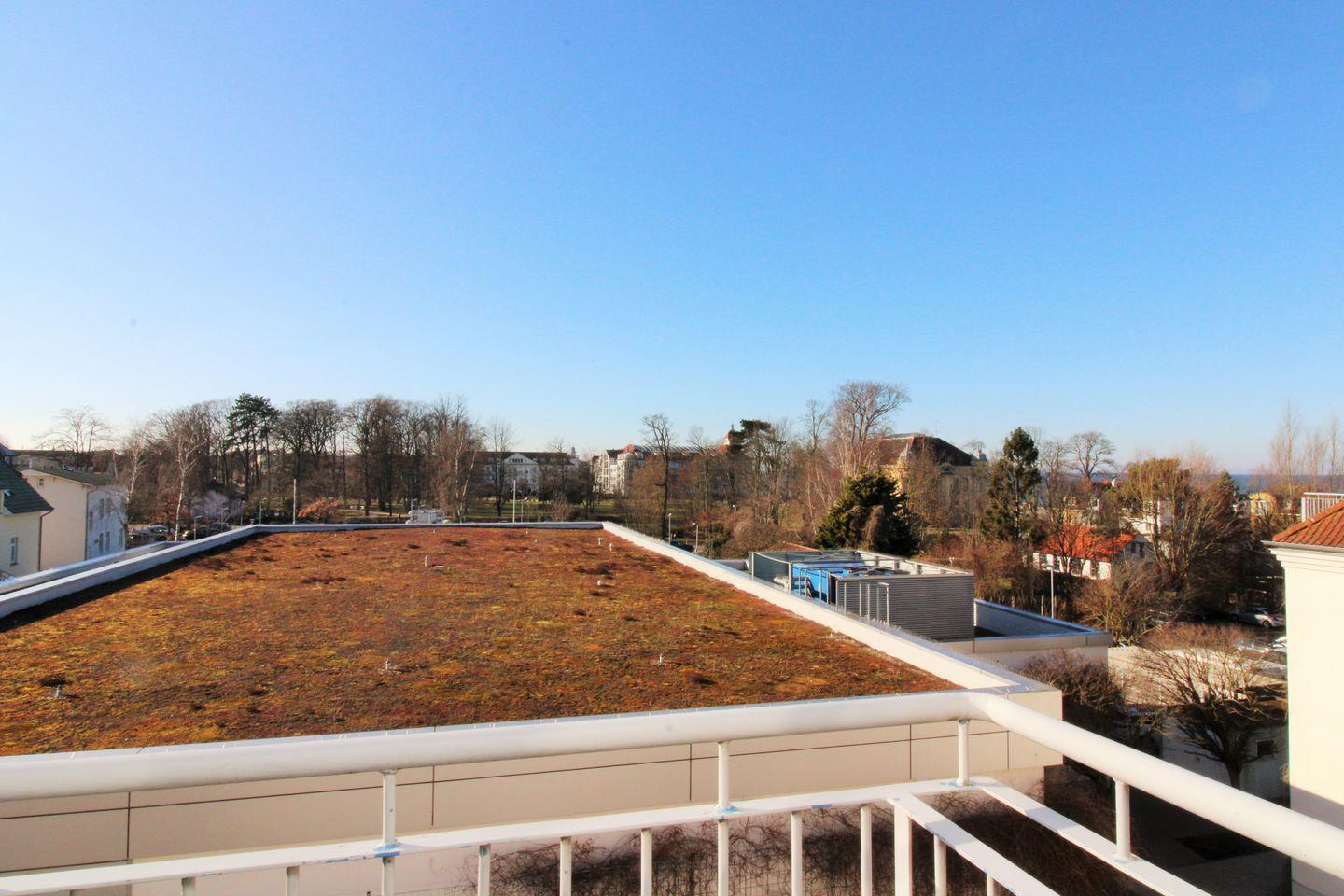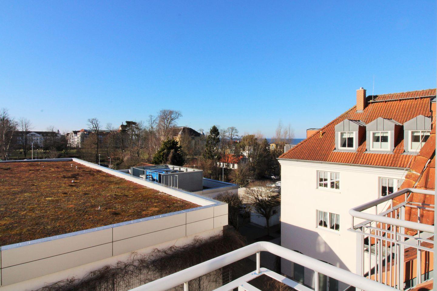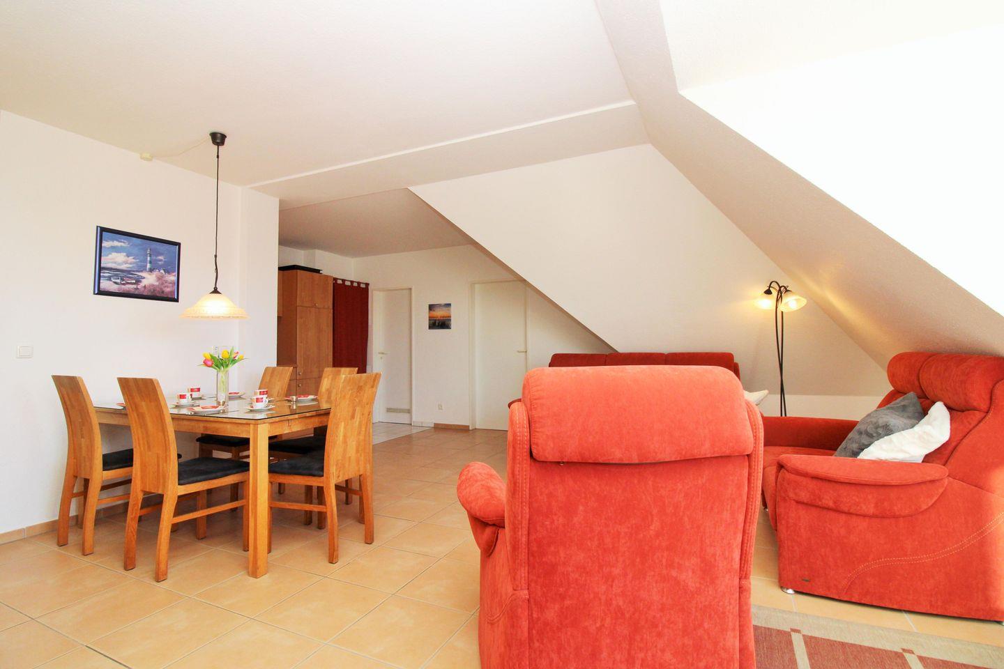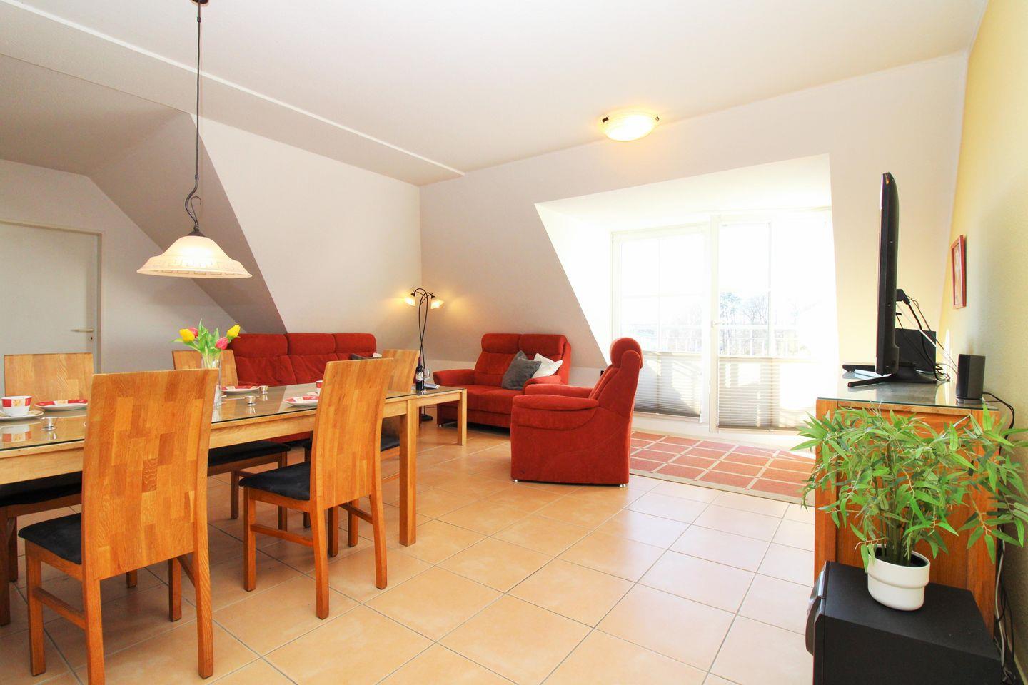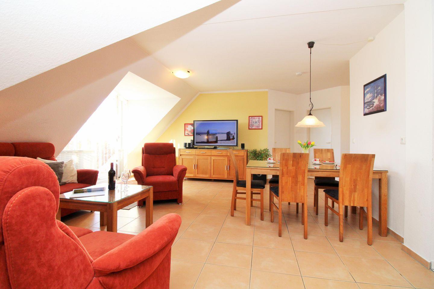 Das freundliche und großzügige Wohn-/Esszimmer verfügt über eine separate Sitzgruppe mit 2 bequemen Couchen, einen Sessel mit Hocker und Couchtisch, einen separaten Esstisch mit 6 Stühlen sowie ein Sideboard. Vom Wohnzimmer aus haben Sie direkten Zugang zu einem kleinen und sonnigen Balkon (nach Westen ausgerichtet) mit 2 Stühlen und einem kleinen Tisch. Hier sitzen Sie entspannt und gemütlich mit weitem Blick über die Dächer von Kühlungsborn und können abends bei einem guten Glas Wein in Ruhe die lauen Sommernächte genießen!