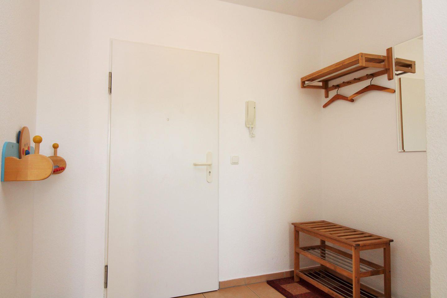 Ihre Schuhe und Jacken können Sie an der Garderobe (mit Spiegel) und Schuhständer im geräumigen Eingangsbereich der Wohnung unterbringen.