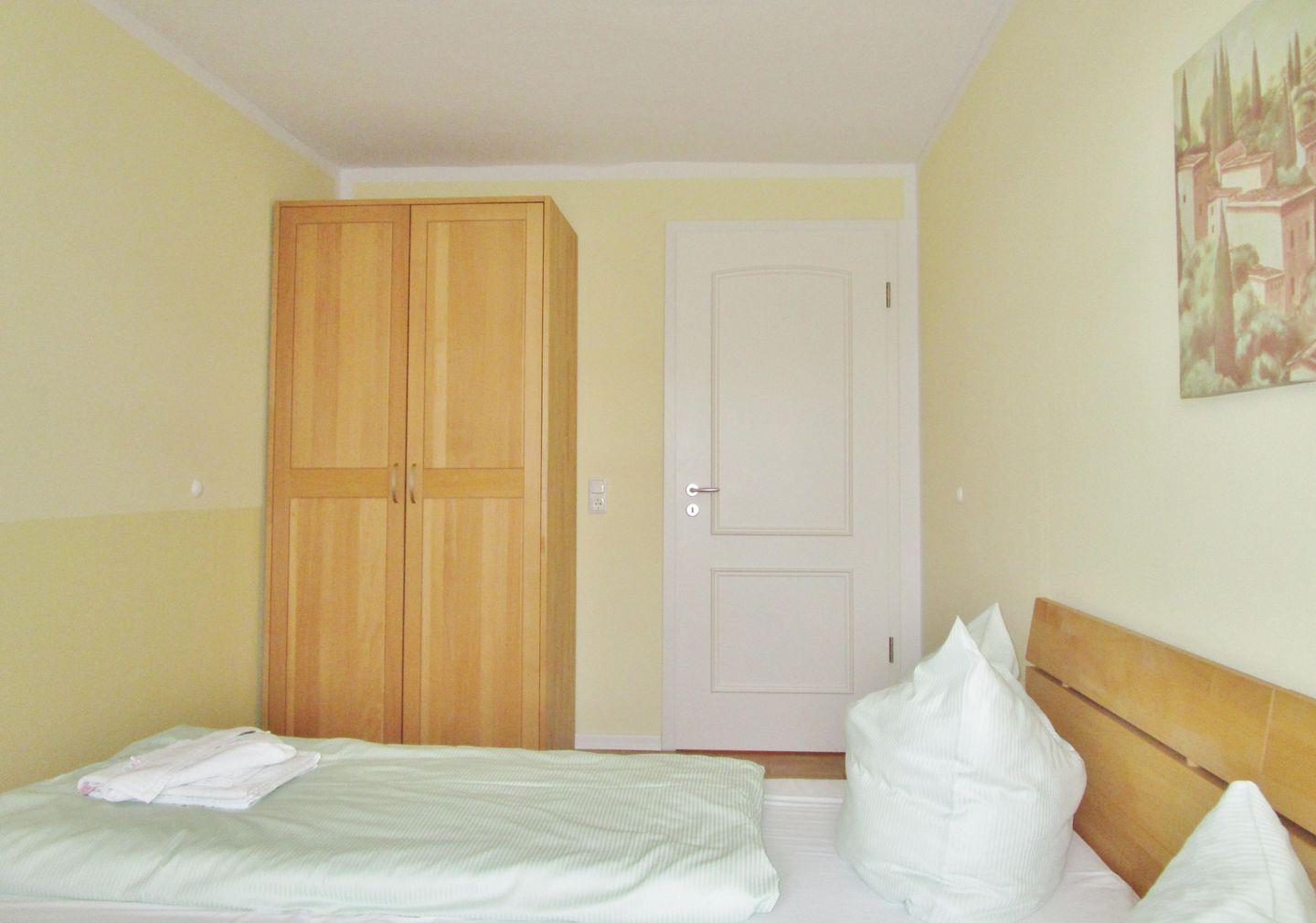 Das zusätzliche 2. Schlafzimmer (Kinderzimmer) verfügt über 2 getrennte Einzelbetten, die sowohl als Doppelbett wie aber auch als freistehende separate Betten genutzt werden können. Weiterhin sind auch hier Nachttische und ein Kleiderschrank vorhanden. Dieses Schlafzimmer verfügt über ein TV-Gerät mit DVD-Player und hat ebenfalls direkten Zugang zum Balkon.