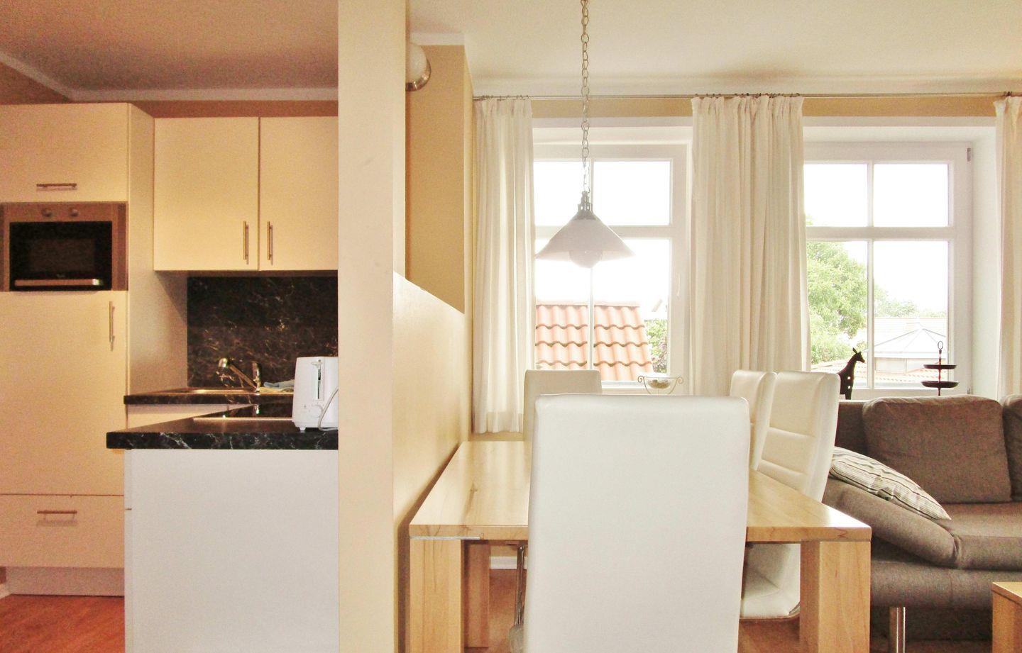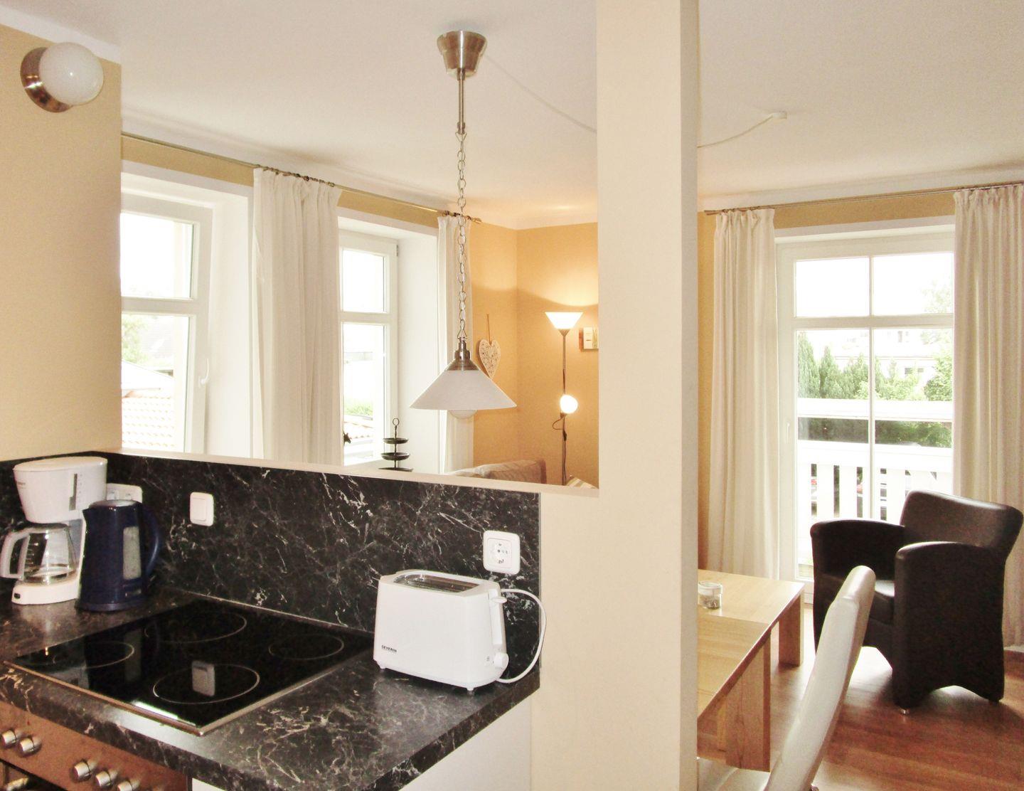 Die mit einer halbhohen Wand zum Essbereich abgetrennte halb offene Küche beinhaltet eine voll ausgestattete und hochwertige Einbauküchenzeile mit 4-Platten-Ceran-Kochfeld, Backofen, Mikrowelle, Kühlschrank mit Gefrierfach, Geschirrspülmaschine, Kaffeemaschine, Wasserkocher und Toaster. Die Küche ist mit Geschirr, Gläsern, Besteck und Töpfen bestens und ausreichend ausgestattet.