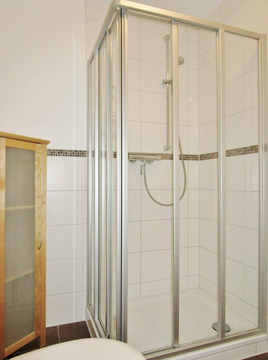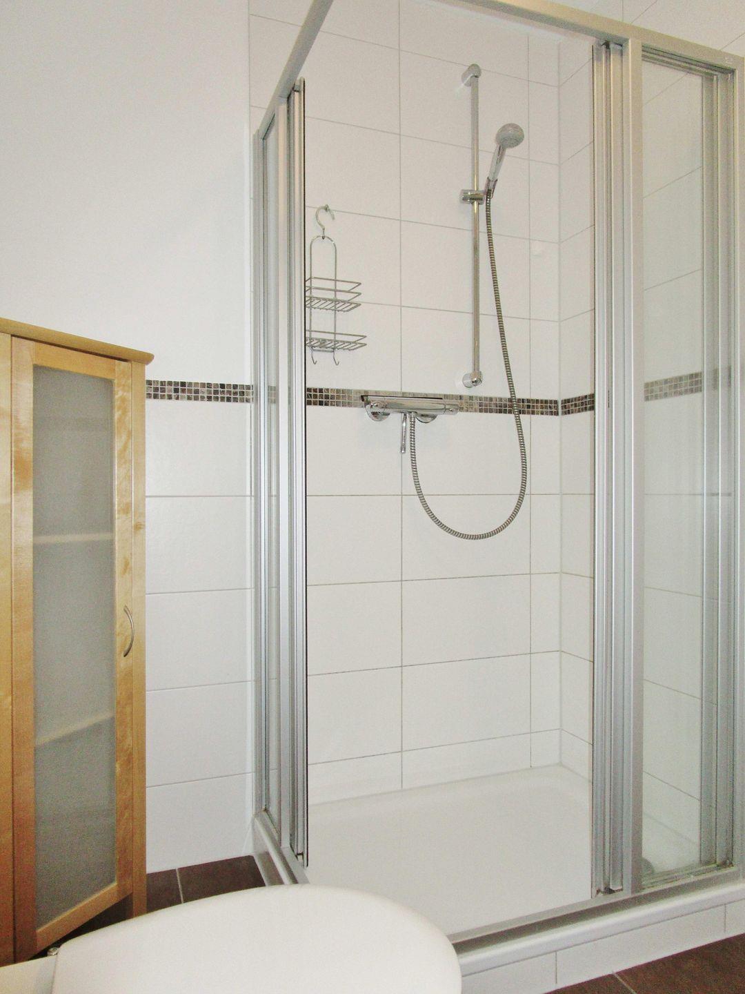 Das helle Badezimmer (mit Fußbodenheizung) verfügt über eine Dusche mit niedrigem Einstieg, Waschbecken und WC, einen Handtuch-Heizkörper sowie einen geräumigen Bade-zimmerschrank.