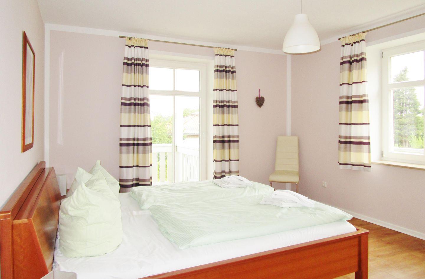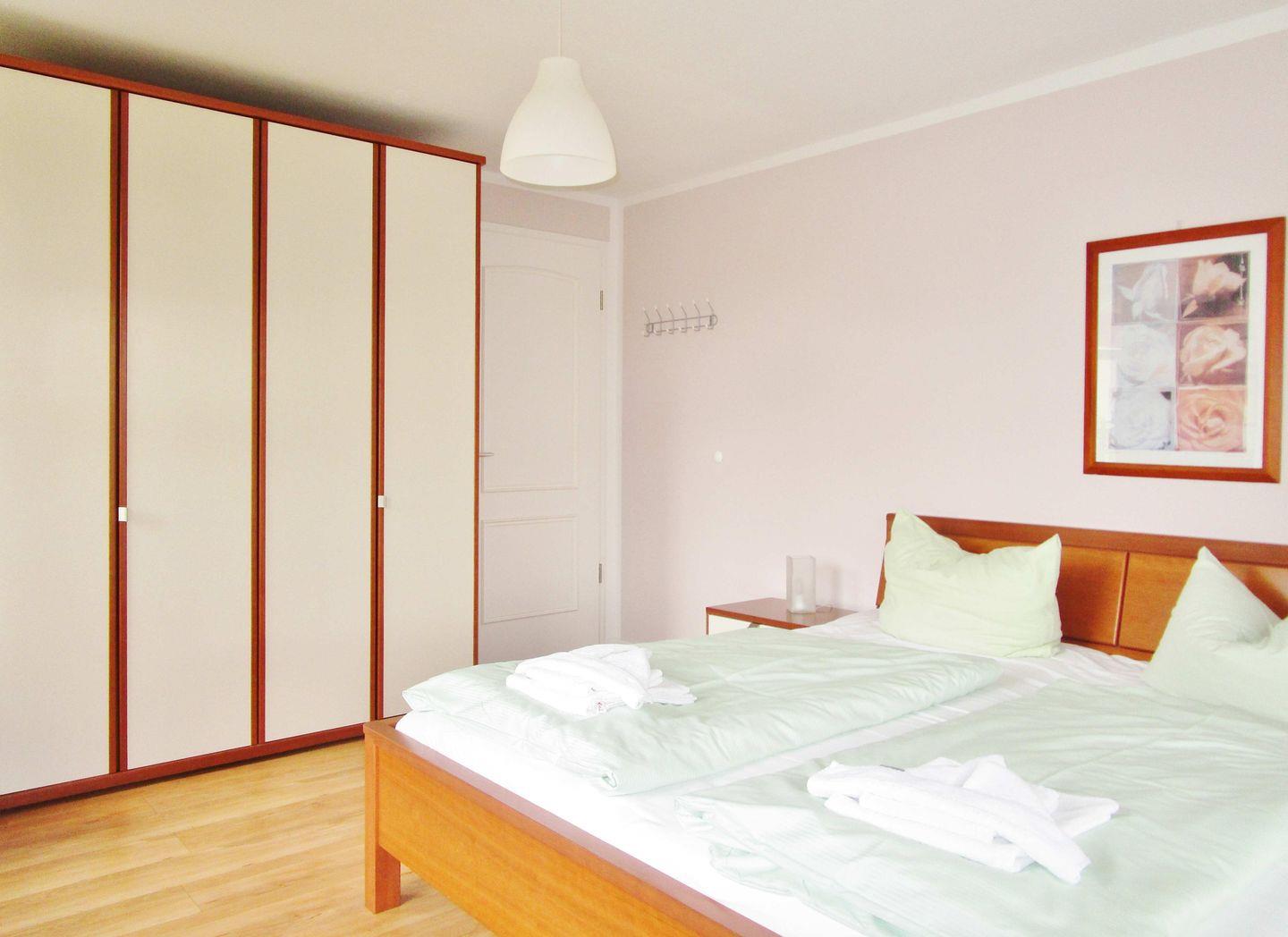 Das freundliche und großzügige 1. Schlafzimmer ist mit einem bequemen Doppelbett, Nachttischen sowie einem geräumigen Kleiderschrank eingerichtet und hat direkten Zugang zum Balkon.
