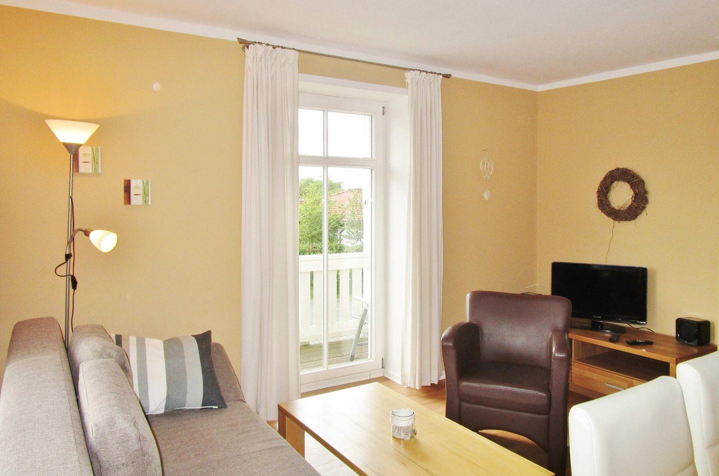 Das moderne und lichtdurchflutete Wohn-/Esszimmer verfügt über eine separate Sitzgruppe mit bequemer (ausziehbarer Schlaf-)Couch, Sessel und Couchtisch, einen separaten Esstisch mit 6 Stühlen (bequeme Freischwinger) sowie ein Sideboard. Vom Wohnzimmer aus haben Sie direkten Zugang zu dem großen und sonnigen Balkon (nach Süden ausgerichtet) mit Markise und Balkonmöbeln (für 4 Personen), der auch von den beiden Schlafzimmern aus erreichbar ist. Hier sitzen Sie entspannt und können in Ruhe Ihre Urlaubstage genießen!