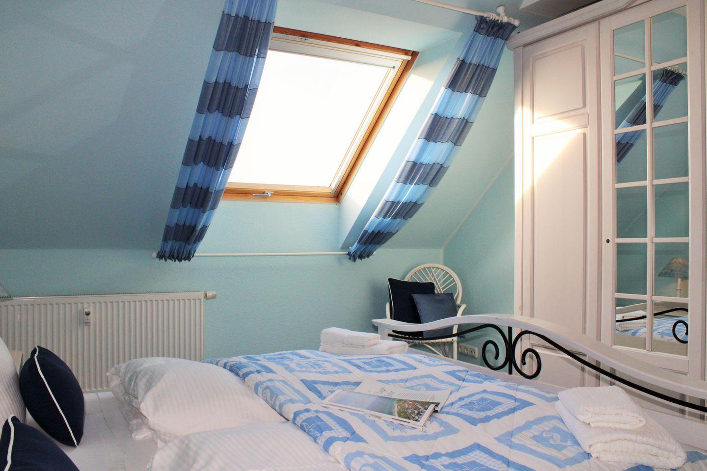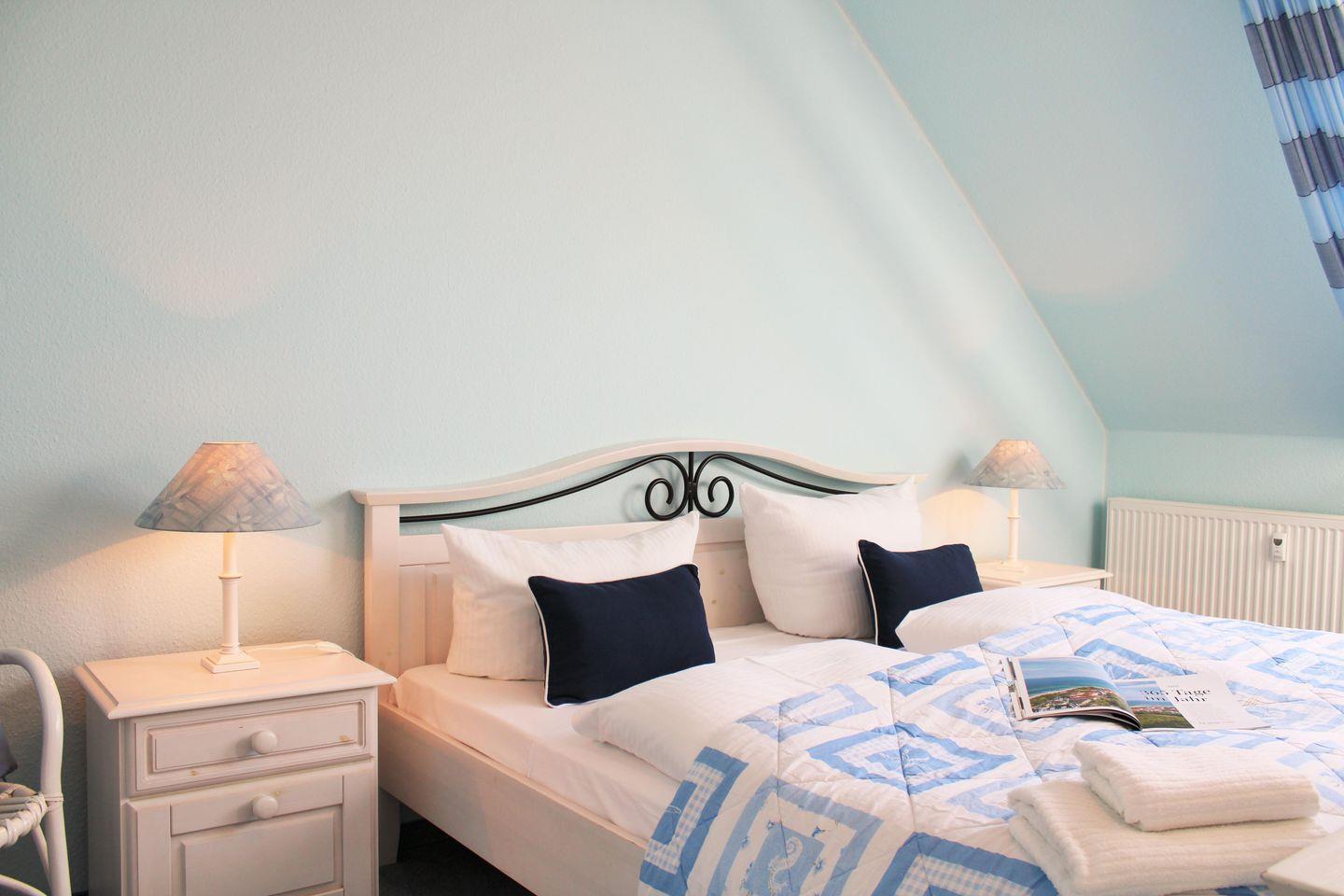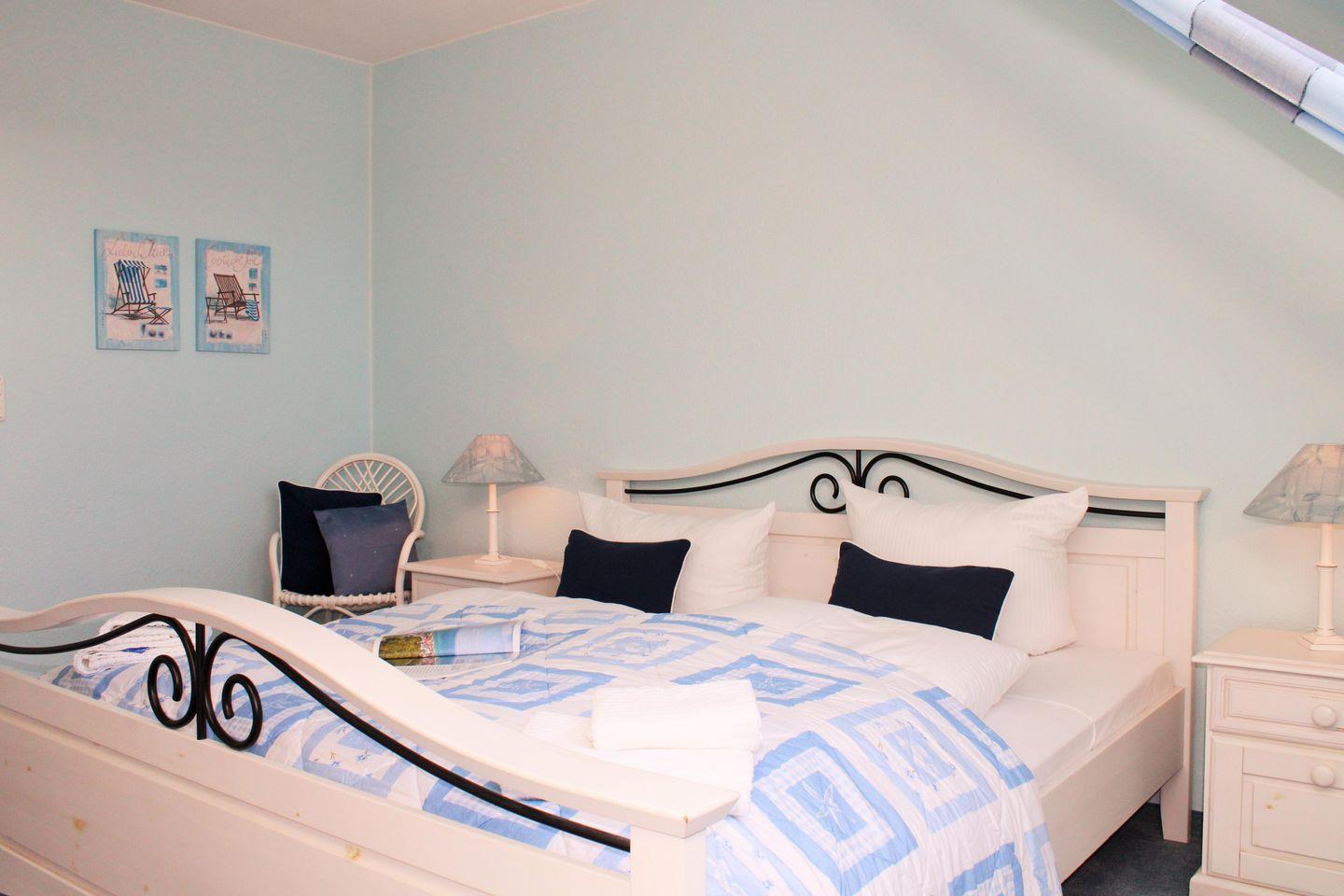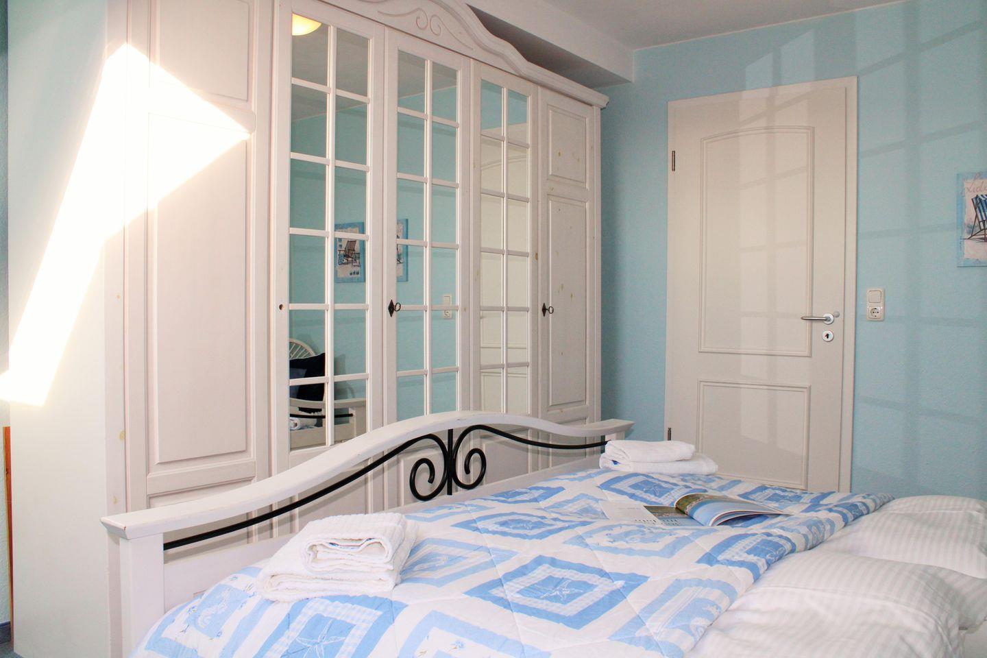 Das gemütliche und großzügige Schlafzimmer ist mit einem bequemen Doppelbett, Nachttischen, einer Kommode sowie einem geräumigen Kleiderschrank eingerichtet.