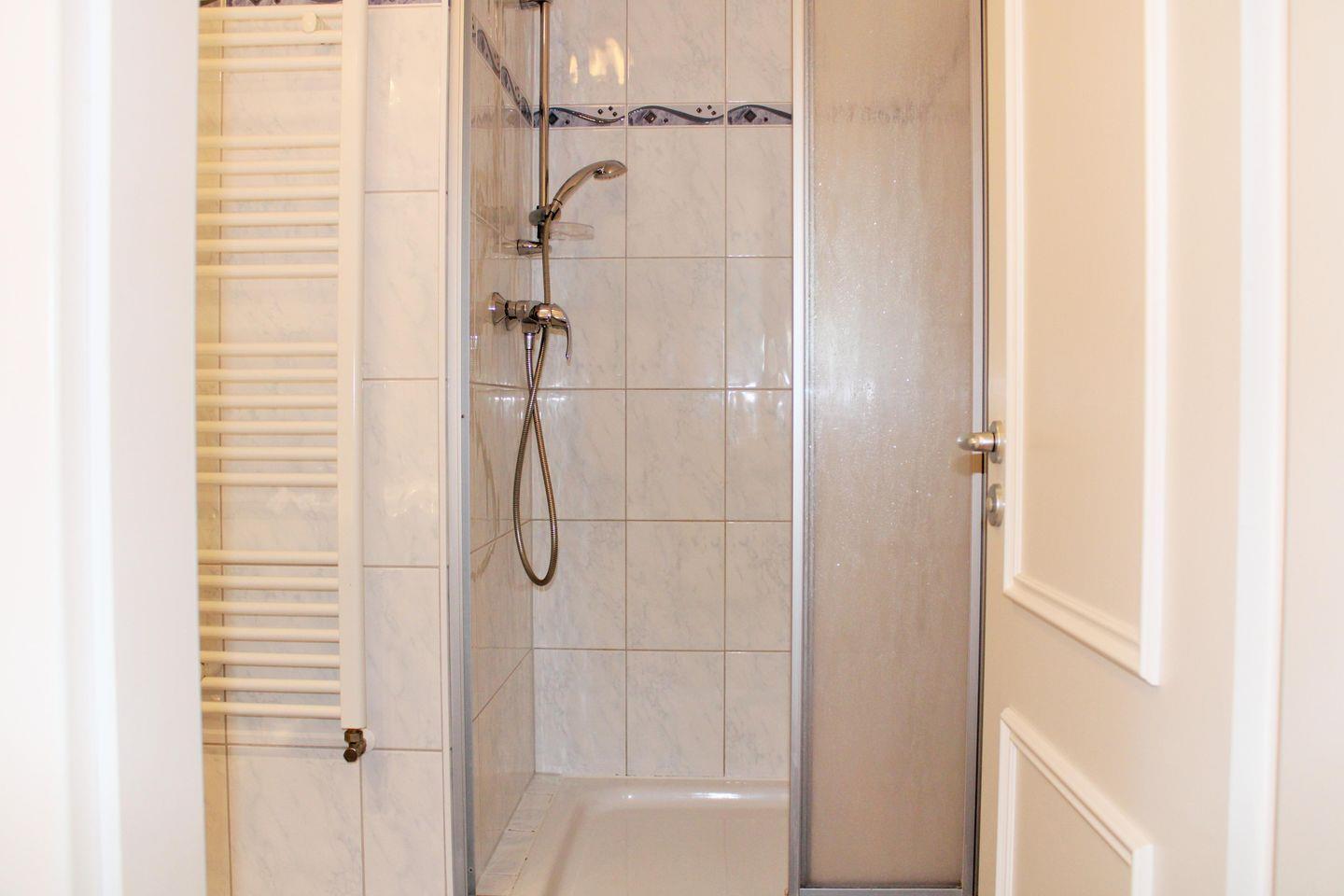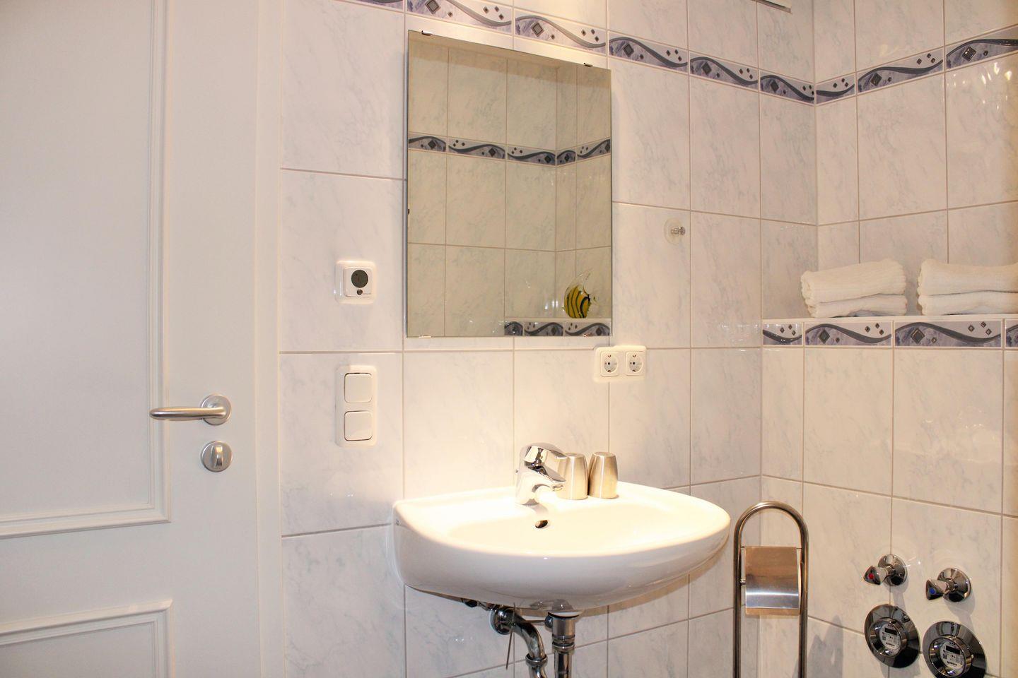 Das Badezimmer (mit Fußbodenheizung) verfügt über eine Dusche mit niedrigem seniorenfreundlichem (!) Einstieg, einen Handtuch-Heizkörper, Waschbecken und WC sowie ausreichend Ablagemöglichkeiten.