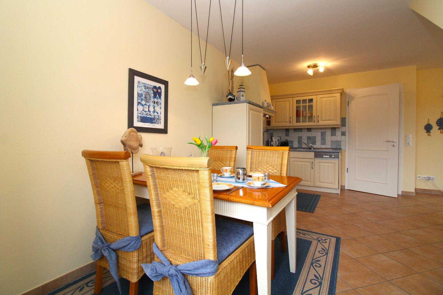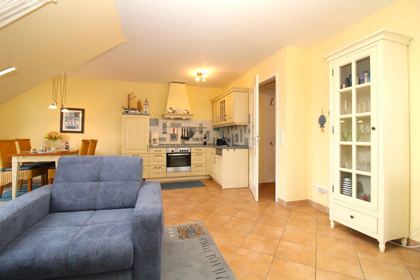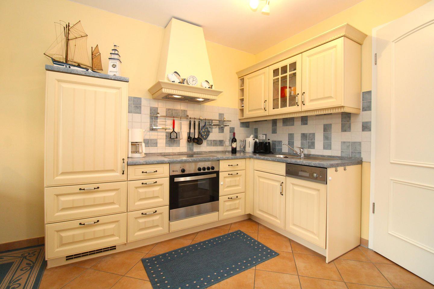Die zum Wohn-/Essbereich hin offene Küche im Landhaus-Stil beinhaltet eine voll ausgestattete und hochwertige Einbauküchenzeile mit 4-Platten-Ceran-Kochfeld, Backofen, Dunstabzugshaube, Kühlschrank, Geschirrspülmaschine, Kaffeemaschine, Wasserkocher und Toaster. Die Küche ist mit Geschirr, Gläsern, Besteck und Töpfen bestens und ausreichend ausgestattet.