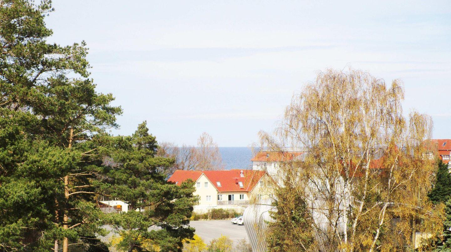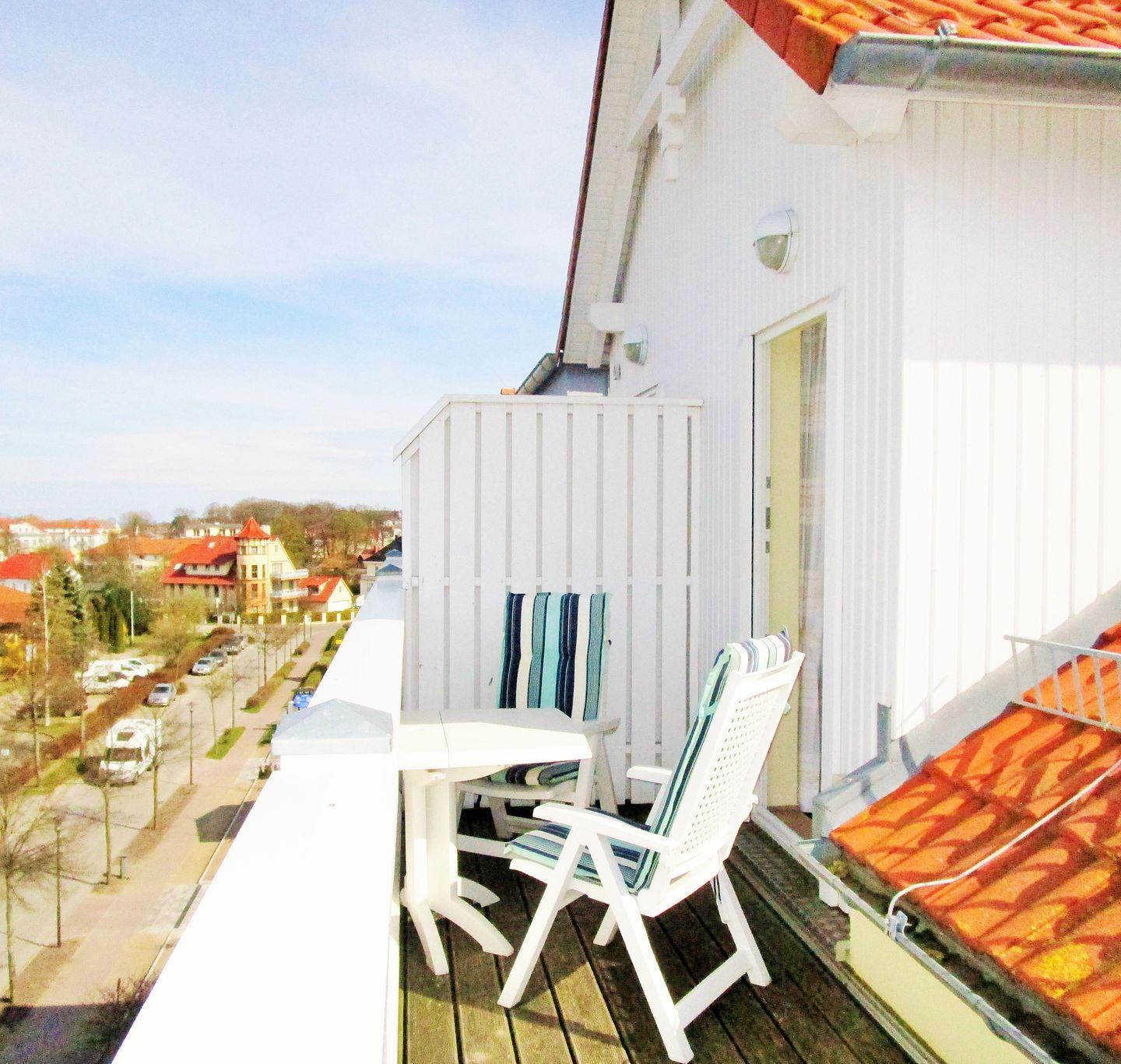 Das freundliche und helle Wohn-/Esszimmer verfügt über eine separate Sitzgruppe mit bequemer Couch, Sessel und Couchtisch, einen separaten Esstisch mit 4 Stühlen sowie ein Sideboard und verschiedene Schränke. Vom Wohnzimmer aus haben Sie direkten Zugang zu dem großen Balkon (nach Norden ausgerichtet) mit seitlichem teilweisen Meerblick sowie Balkonmöbeln. Hier sitzen Sie entspannt und können in Ruhe den wunderschönen Blick über die Dächer und Gärten von Kühlungsborn bis hin zum Leuchtturm nach Bastorf genießen!